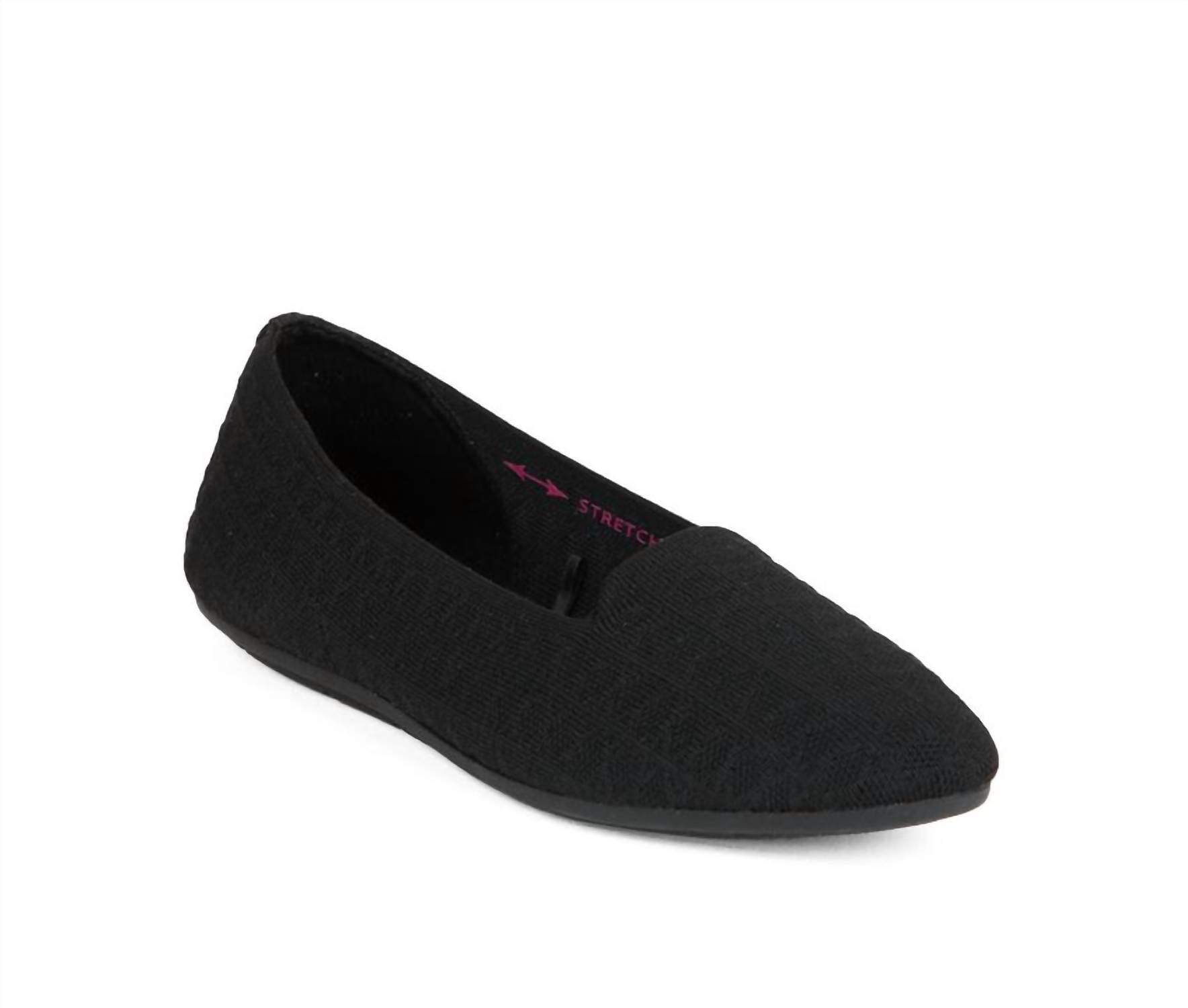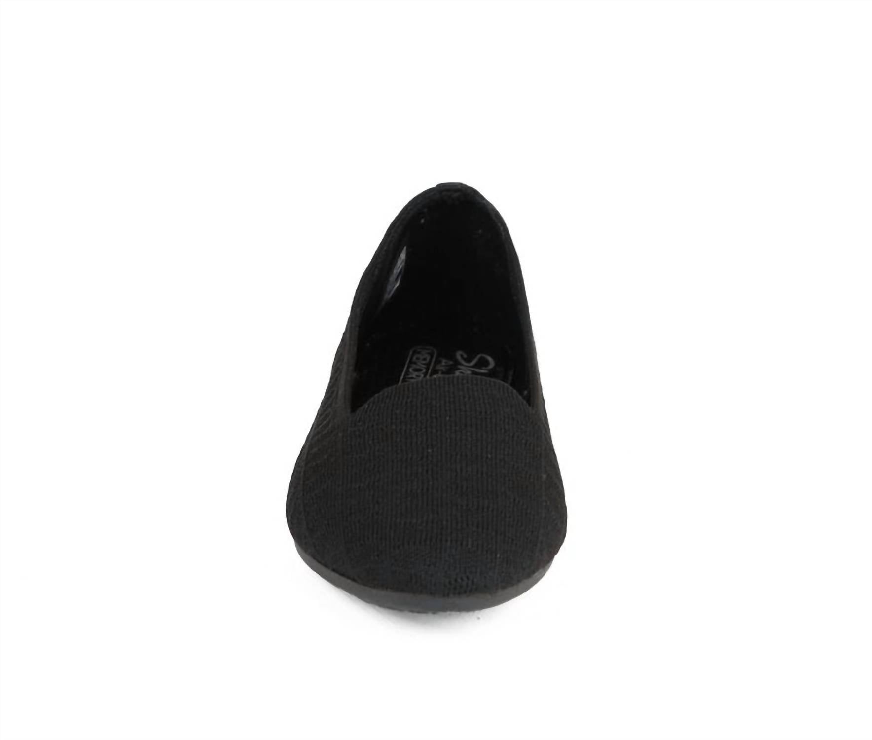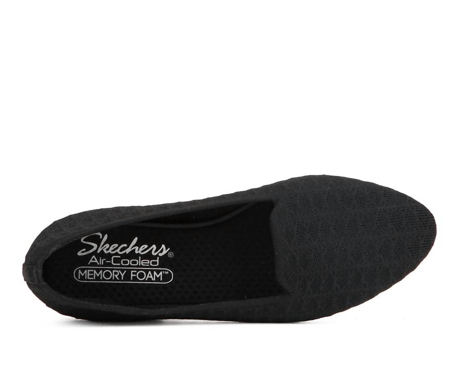Loafers so versatile you can wear them with just about anything. Introducing the Women's Cleo 2.0 Flats by Skechers, a chic blend of fashion and comfort in classic black. These flats feature a Stretch Fit® slip-on design for effortless wear and a vegan skimmer flat style with a round toe. Crafted from engineered knit linen fabric, they boast an Air-Cooled Memory Foam® cushioned insole and textured textile uppers for superior comfort. Designed with a flexible rubber traction outsole and a signature Skechers® logo detail, these flats are also machine washable. Ideal for a medium-width fit, they perfectly complement your everyday casual ensemble.