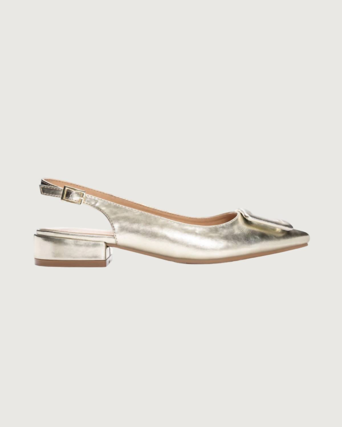A classic loafer that is both comfortable and polished. Introducing the Women's Lindy Slingback Flats by Chinese Laundry, a chic addition to your footwear collection. Crafted from gold metallic material with a sleek pointed toe and cushioned footbed, these flats ensure style and comfort. Featuring a sophisticated buckle closure and a low block heel measuring 1.25 inches, they blend quiet luxury with practicality. Ideal for a summer dinner party, these faux leather slingback flats deliver elegance and poise for any New Year's Eve celebration.