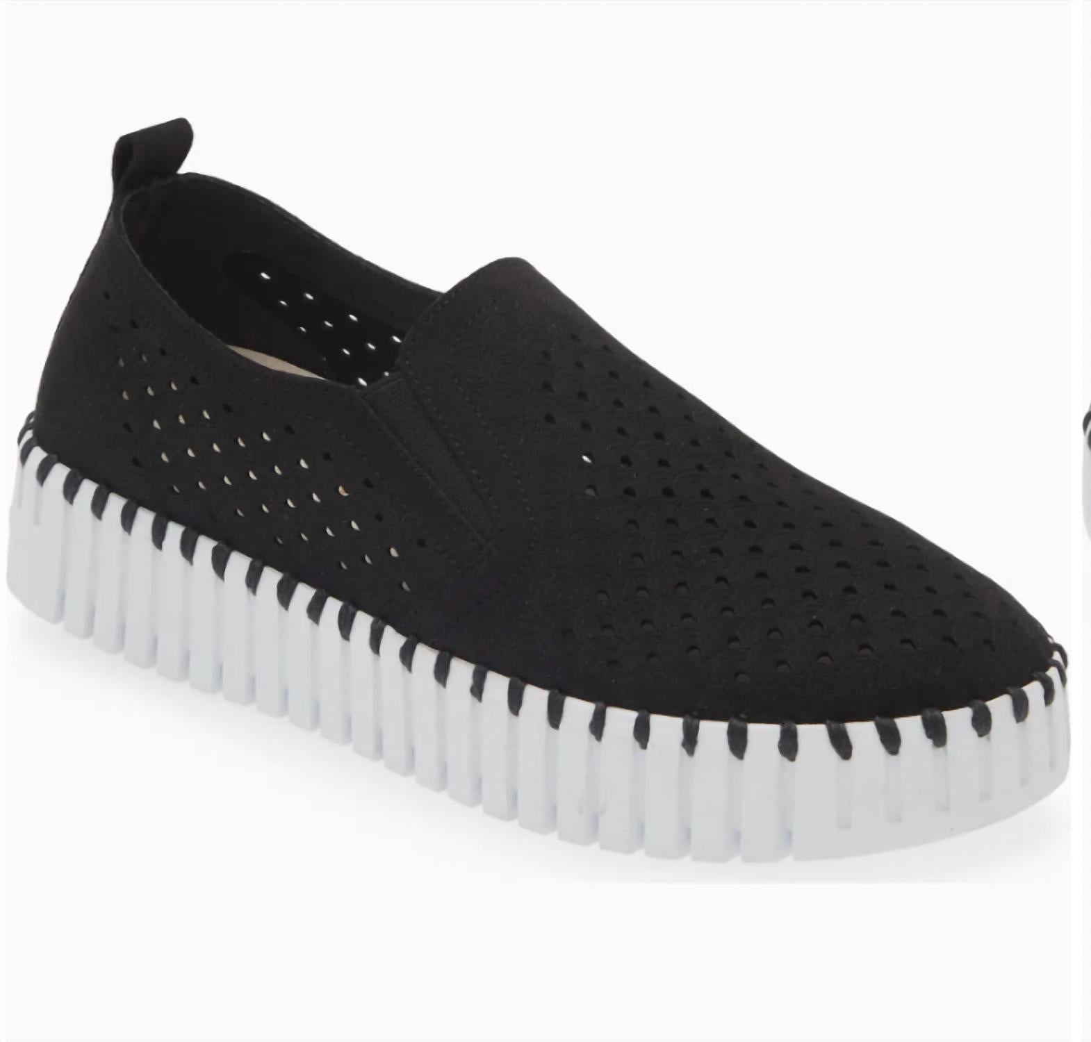 A preppy yet feminine take on the classic loafer. Diamond perforations bring breezy, breathable comfort to this flexible slip-on set on a bold crenellated platform sole with a cloud-like feel. 1 1/2" heel; 1 1/4" platform Removable insole Recycled textile upper/leather lining/rubber sole