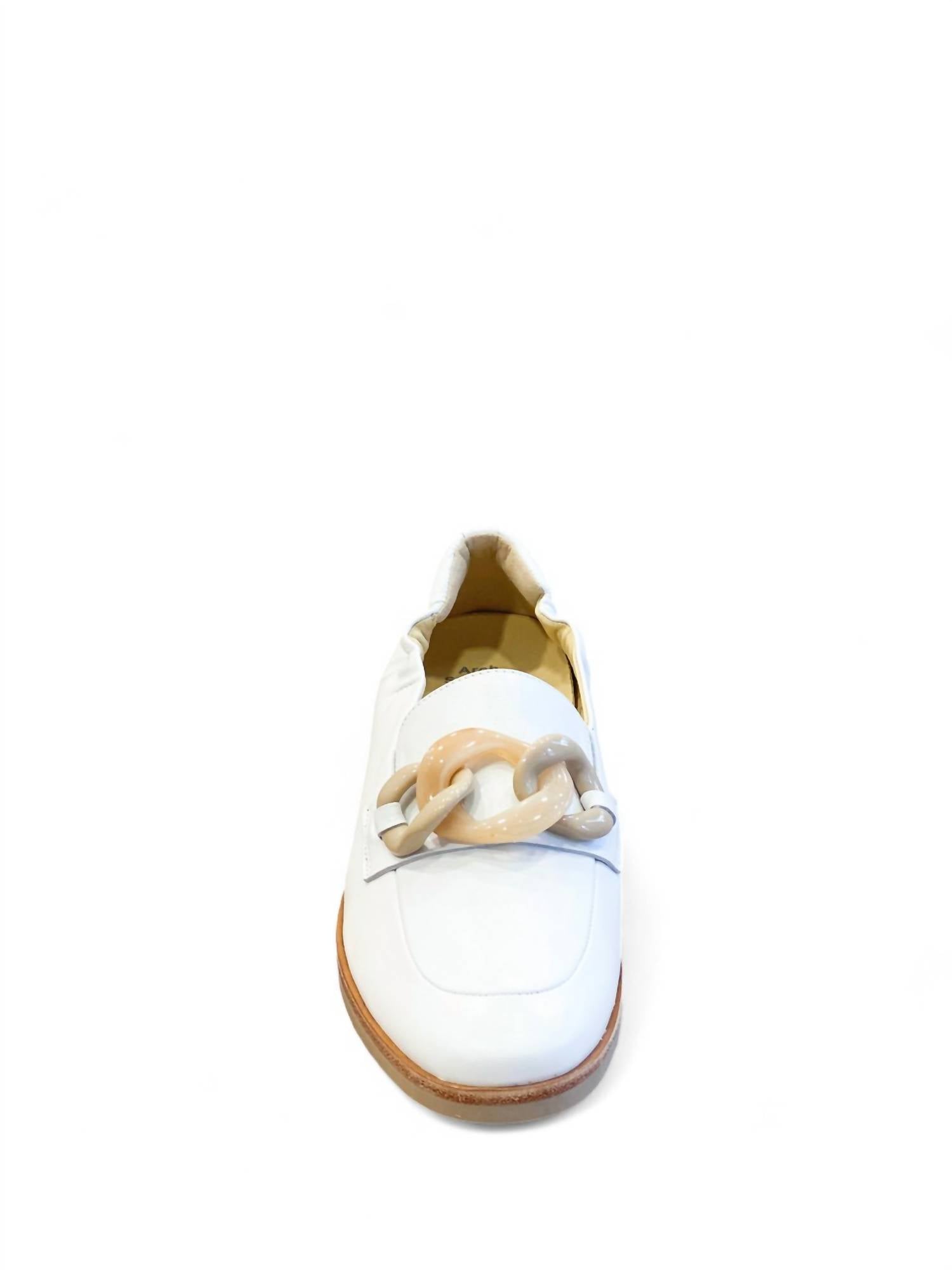 A classic loafer that is both comfortable and polished. Add a touch of luxury to your wardrobe with this sophisticated loafer, boasting an iridescent sheen that catches the eye. Hand-crafted in Portugal, this shoe features good arch support for all-day comfort, as well as a decorative chain detail that adds a hint of glamour. Please note that this style runs small, so be sure to size up for the perfect fit.