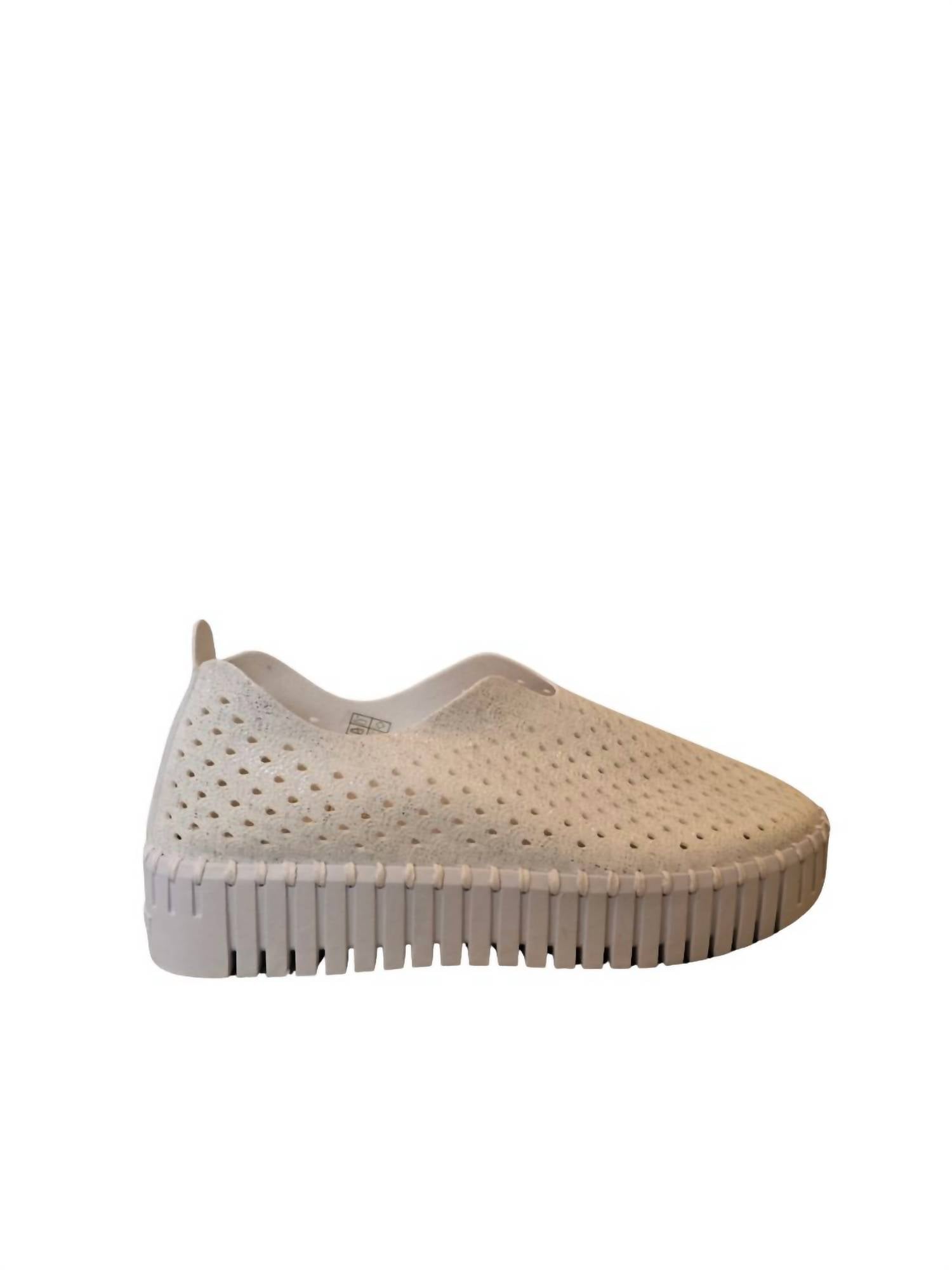 A preppy yet feminine take on the classic loafer. Discover the Plateau Tulip Shoe by ILSE JACOBSEN HORNBÆK, featuring an upper crafted from recycled microfiber with the distinctive laser-cut Tulip pattern, seamlessly integrated with the iconic Tulip outsole composed of 75% natural rubber and 25% recycled rubber, secured with matching recycled thread without glue for sustainability. The shoe offers a comfortable fit, enhanced by a pig suede-lined insole with added padding and support. This versatile style combines fashion and eco-consciousness, finished with a touch of sparkle for extra flair.