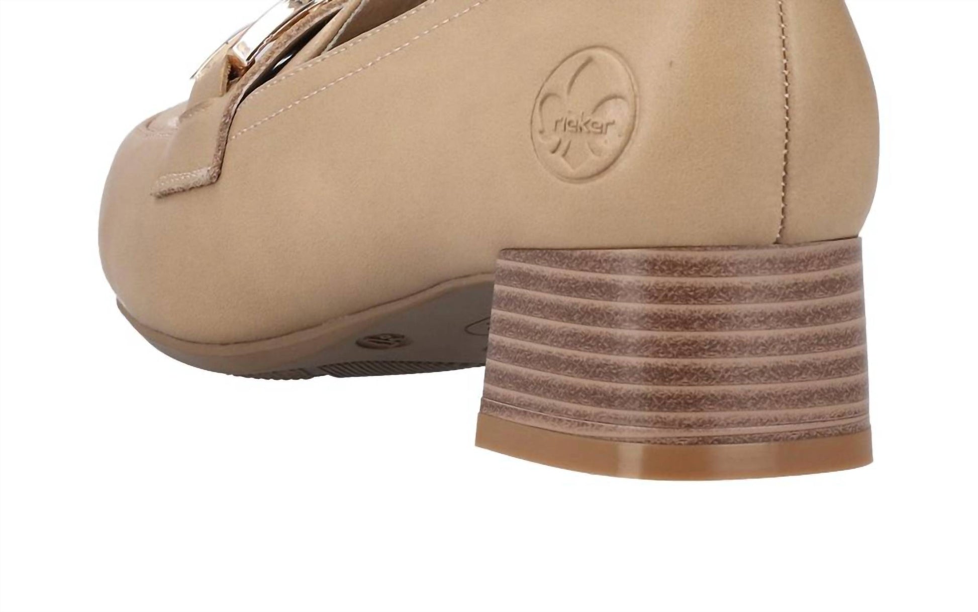Loafers so versatile you can wear them with just about anything. Discover the Women's Violet 52 Heeled Loafer by RIEKER, crafted for the perfect blend of comfort and style. These loafers feature premium leather composition, ensuring durability and a smooth finish. With a classic design enhanced by a decorative golden accessory, these loafers offer a slip-on convenience with no fastener. The low block heel and grippy sole provide stability, while the extra soft interchangeable insole and supple leather lining deliver exceptional comfort and breathability.