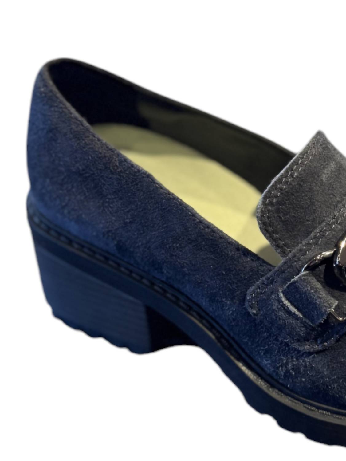A preppy yet feminine take on the classic loafer. Introducing the Women's Monte Loafer by Salvia in a sophisticated hue, crafted in premium suede. These slip-on loafers feature a luxurious gold chainlink bit detail, elevating any outfit. Designed with a round toe and block heel, they offer a chic silhouette and the low heel height ensures comfort throughout the day. Perfect for adults seeking both style and ease in any setting.