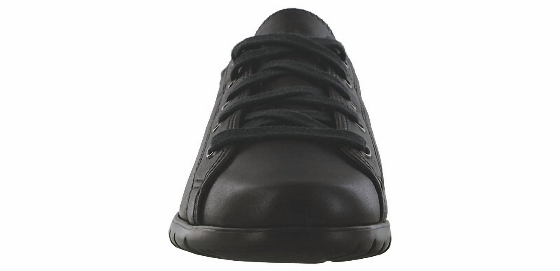 Introducing the Solstice II Lace Up Flat Shoes by SAS, now available in a chic color. These women's flat heel shoes feature an ultra-flexible EMAX® EVA sole for superior comfort and shock absorption, alongside a stylish genuine leather upper. Designed with a removable, textile comfort footbed that provides added metatarsal and arch-support, these shoes ensure a cushioned walking experience. Toe Shape: Round. Heel Height: 0.75 inch. The soft cushioned upper lining and elasticized topline offer a secure and adaptable fit perfect for all-day wear.