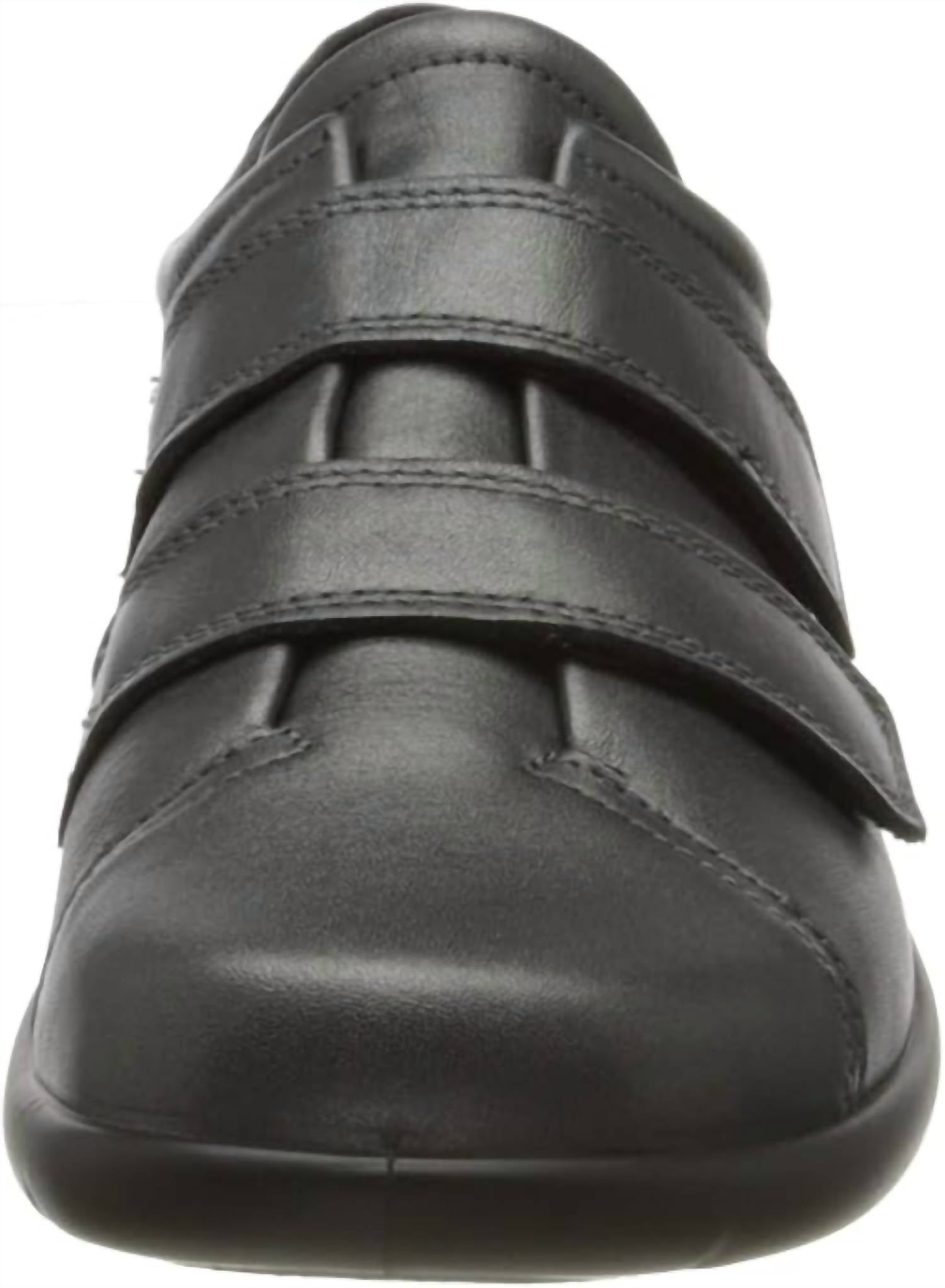 A classic loafer that is both comfortable and polished. Elevate your everyday style with the Women's Leap Shoes by Hotter, designed in a sleek black finish for versatile wear. Crafted from premium leather for both the outer and inner materials, these shoes offer a luxurious feel and durability. They feature a convenient Hook & Loop closure with twin touch-close straps for a secure fit. Built for comfort with a padded collar and removable insoles, these flats are completed with a round toe design and a durable rubber sole.