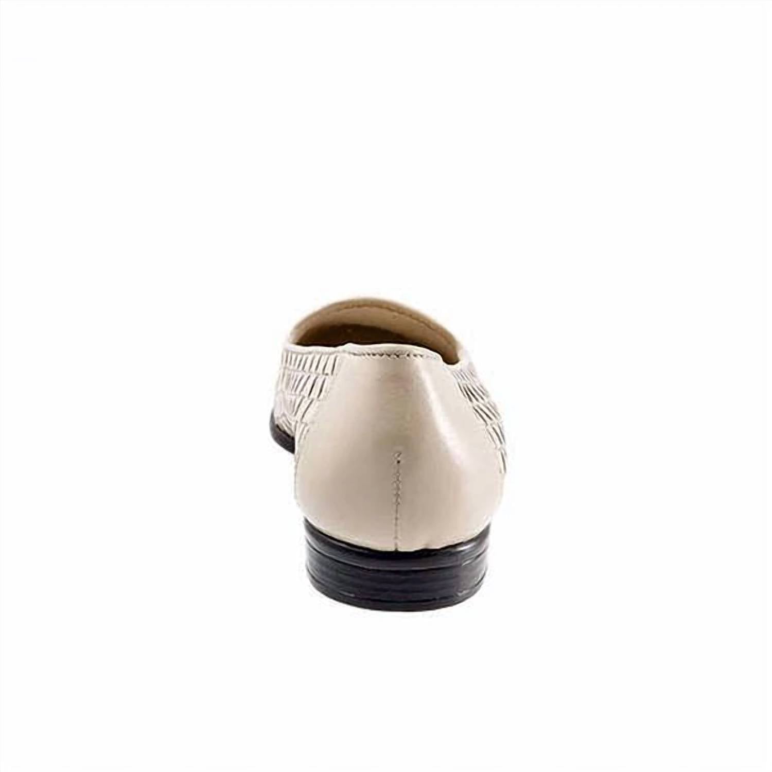 Loafers so versatile you can wear them with just about anything. Step out in comfort with the Women's Liz Woven Leather Shoes by Trotters, a sophisticated addition to any wardrobe. These flats boast an elegant bone color and feature a 5/8" heel height with an almond toe shape, perfect for all-day wear. Crafted with a leather upper and cushioned polyurethane footbed, they provide unmatched comfort and support. The slip-resistant, lightweight, flexible rubberized sole ensures stability, making them ideal for any outing.