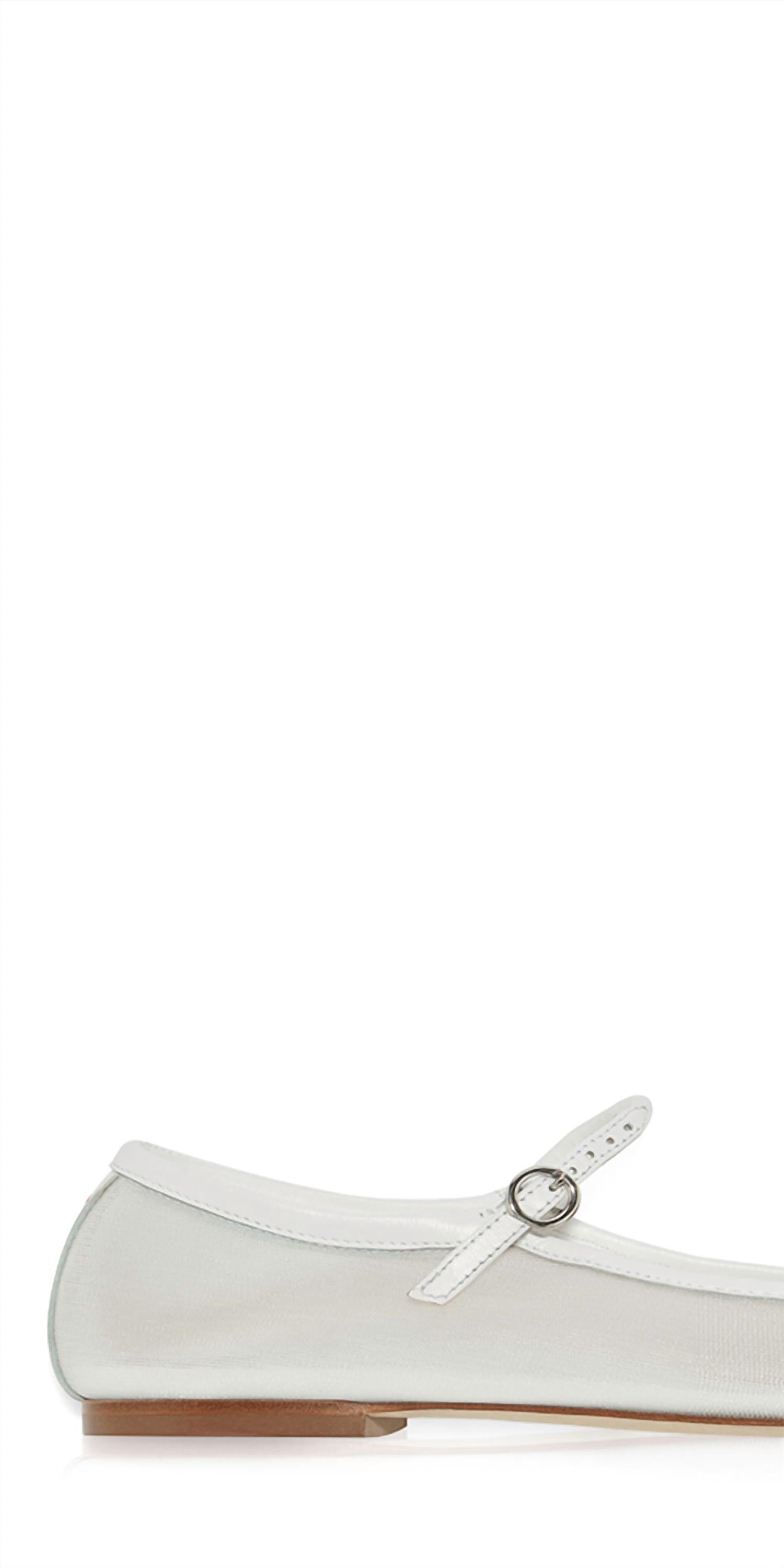 A classic loafer that is both comfortable and polished. Introducing the Aeyde Women's Uma Mesh Mary Jane Flats in Optic White, a stylish and breathable option for warmer months. These flats are crafted in Italy, featuring an 80% mesh and 20% Nappa leather exterior with a comfortable 100% leather lining. With a modern square toe and secure buckle strap closure, these shoes offer a chic minimalist look for spring occasions. They feature a flat heel with a height of 0.8 cm, fitting true to size in European sizing.