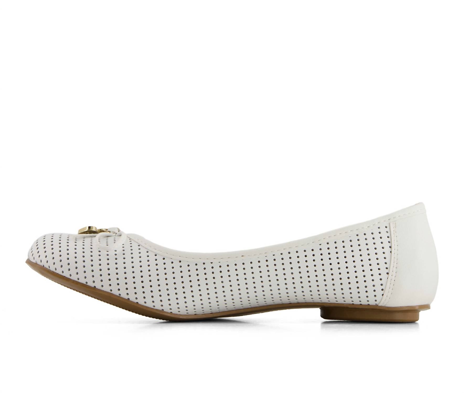 A preppy yet feminine take on the classic loafer. Step into effortless elegance with Andrea Women's Laser Cut Pattern Ballerinas in pristine white. These flats showcase chic laser-cut detailing on genuine leather and feature a flat heel with a comfortable round toe design, perfect for workwear or summer parties. Enjoy the lightweight feel and foam insole that provides all-day support, making this versatile pair your go-to choice for any occasion. Note: Made for holiday parties like the 4th Of July, these Andrea ballerinas prioritize comfort and quality.