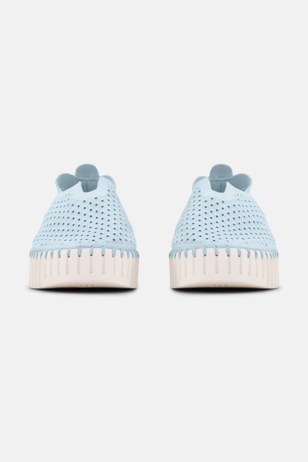 A classic loafer that is both comfortable and polished. Elevate your shoe collection with the Women's Platform Tulip Slip-on Shoes by Ilse Jacobsen in Ash Blue, a stylish choice for summer streetwear. These flats are meticulously crafted from a Nylon blend with a laser-cut pattern and a round toe design. Their modern platform version of the Tulip outsole provides added lift while maintaining lightness and ease, complemented by a softly padded insole for superior comfort. Designed with sustainability in mind, they feature recycled thread stitching and no glue, embodying an eco-conscious approach to fashion.