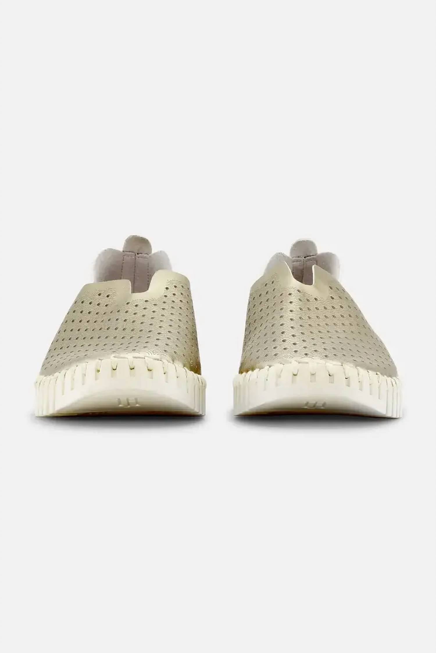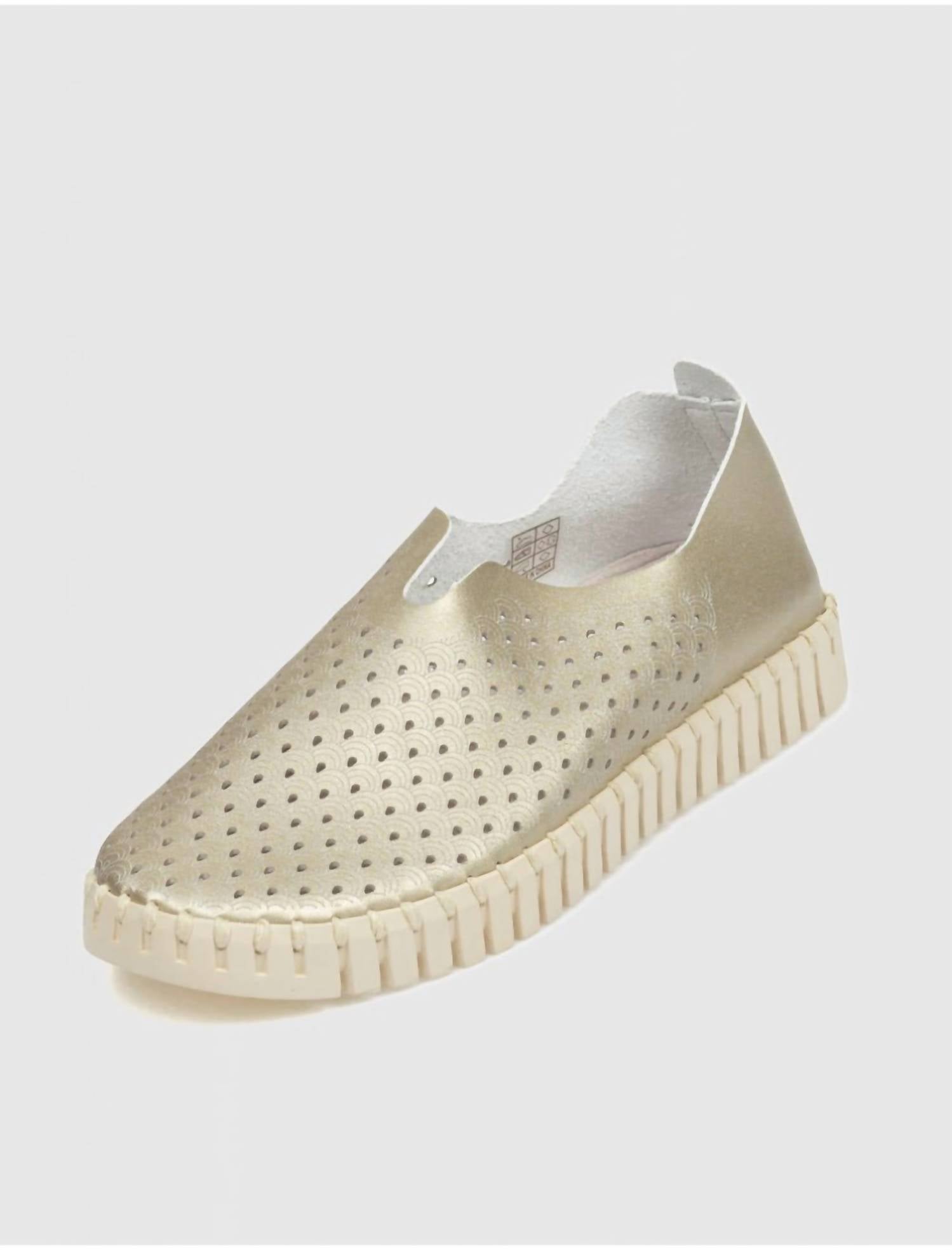 Loafers so versatile you can wear them with just about anything. Step into sophisticated comfort with the Women's Tulip Platform Tennis Shoe by Ilse Jacobsen in an elegant Platinum Gold shade. Embracing an eco-friendly design, the upper is crafted from 60% Nylon and 40% PU recycled microfiber with a charming laser-cut pattern, seamlessly attached to the 75% natural and 25% recycled rubber outsole using recycled thread. The interior features a plush insole with a composition of 60% EVA and 40% Pigskin lining, ensuring a snug fit. Perfect for travel and suitable for fall, this round toe shoe with a platform height merges style and quiet luxury effortlessly. Designed in Denmark.