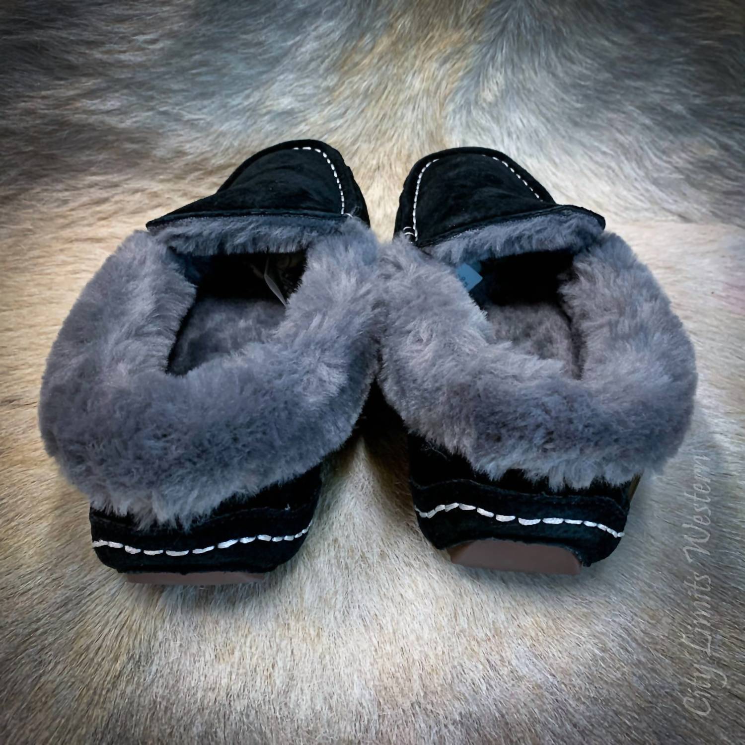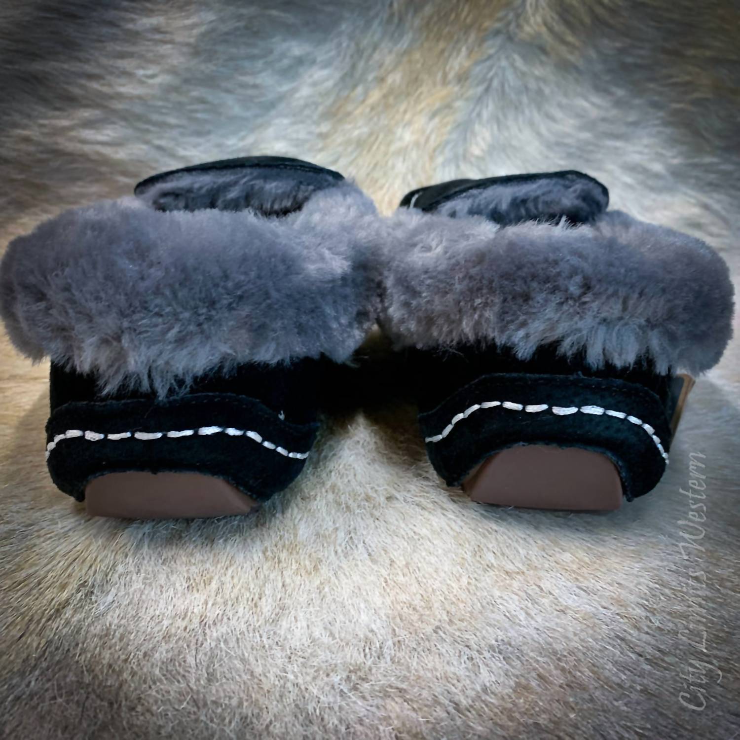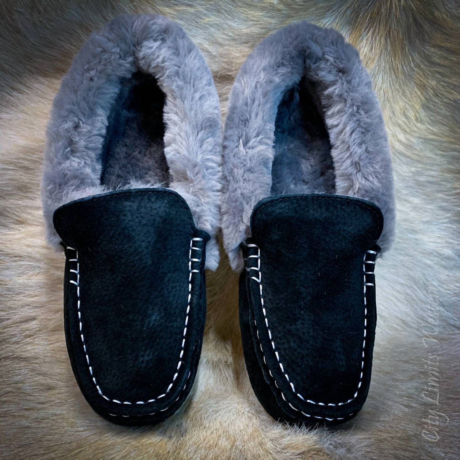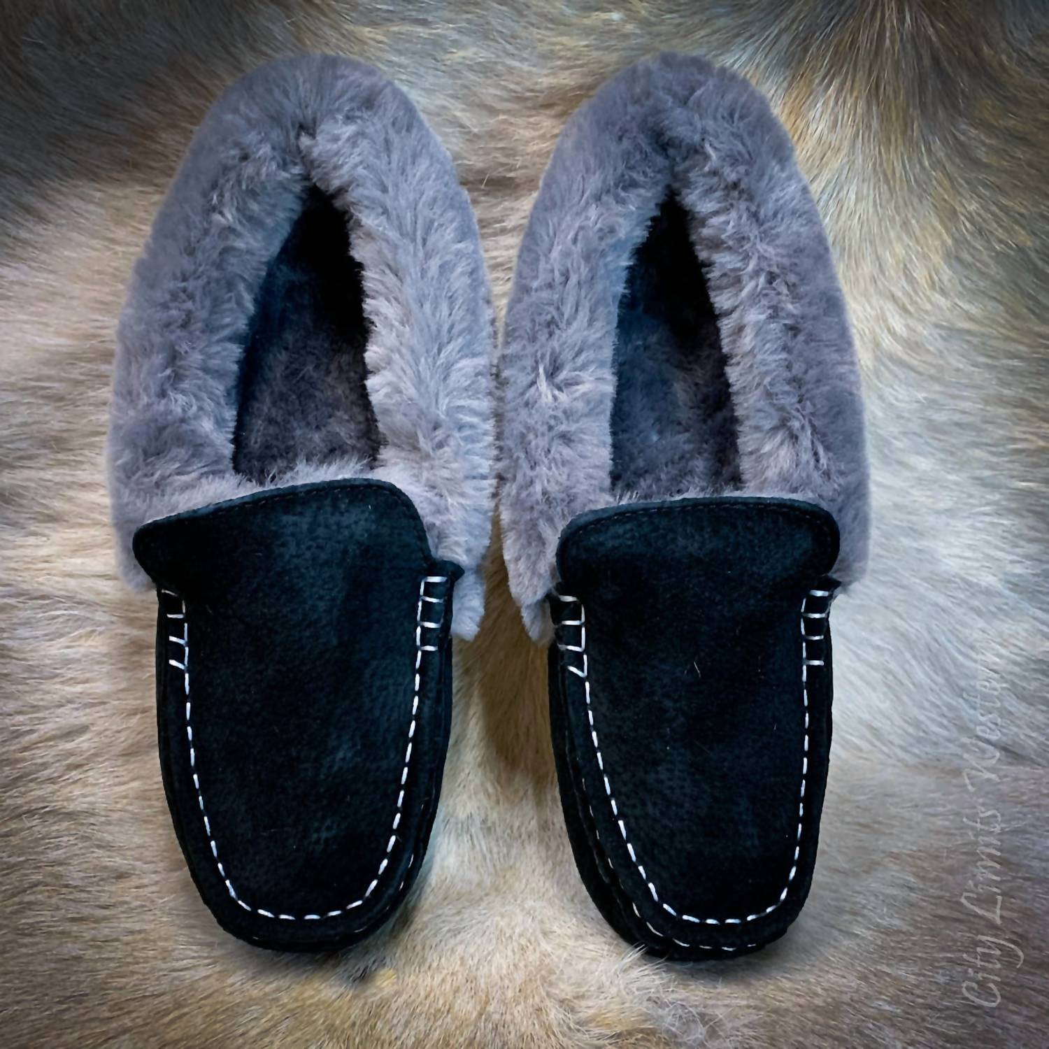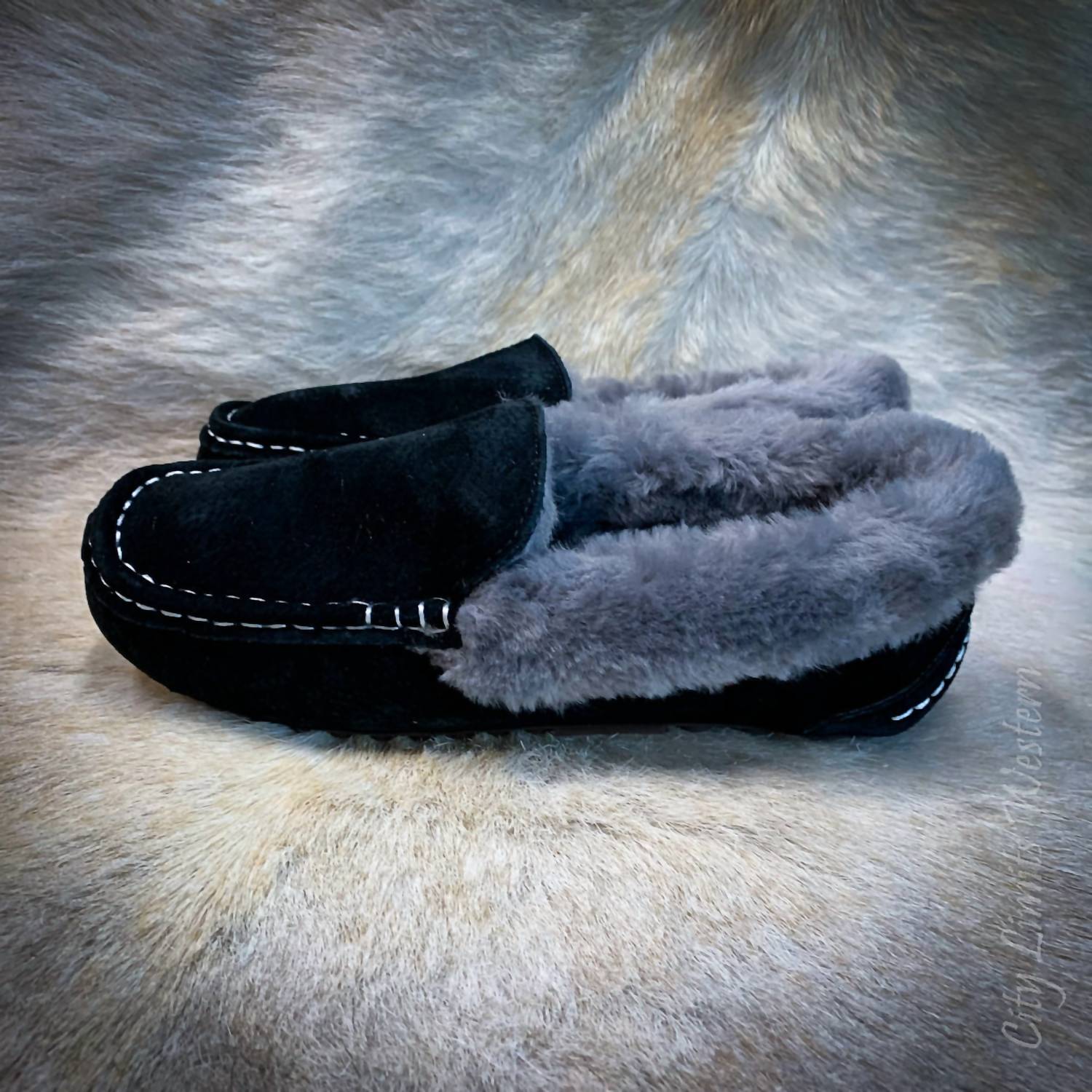 A classic loafer that is both comfortable and polished. Step into the season with Lamo's Women's Aussie Moc Shoes in classic black, perfectly blending comfort and style. Featuring a round toe design, the shoe boasts a textile and rich suede upper coupled with a premium faux fur lining and collar for ultimate coziness. The 100% Australian sheepskin footbed ensures comfort while the LAMO-LITE EVA outsole provides lasting durability. Ideal for fall and holiday parties, this moccasin is a chic addition to any wardrobe.
