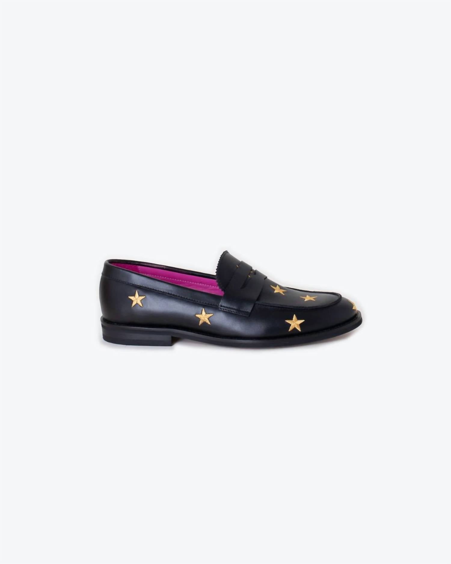 A classic loafer that is both comfortable and polished. Step into the spotlight with Vilagallo's Women's With Star Accents Shoes, designed to captivate with its stunning black nappa leather composition. These loafers showcase luxurious gold star embroidery on a classic slip-on silhouette, perfect for those who appreciate a blend of timeless style and bold flair. The design features a rounded toe and scalloped tongue, complemented by a comfortable black sole and eye-catching fuchsia lining. Ideal for engagements and workwear, these shoes are your go-to for making a statement during the fall season and New Year's Eve.