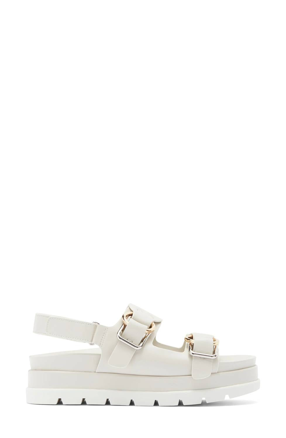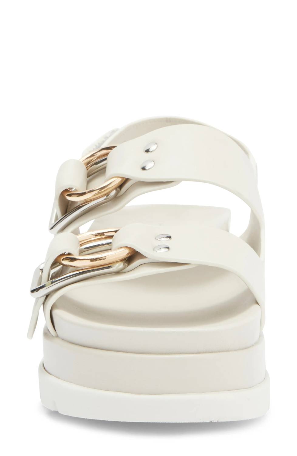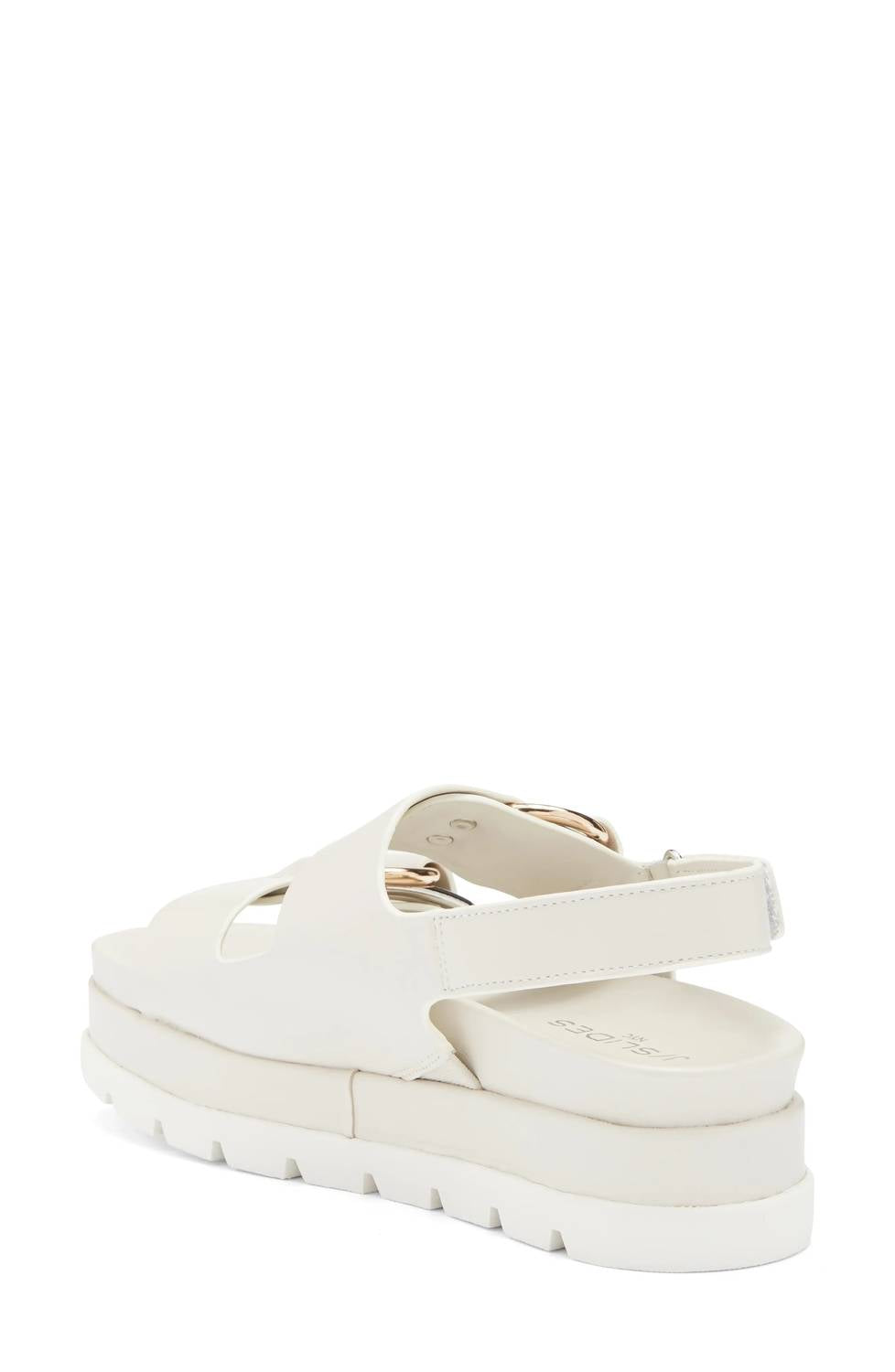 The perfect variation on one of our favorite trends this season. Step into style with the Women's Blast Platform Sandal by J/SLIDES, featuring a striking strappy upper with two-tone polished buckles for added visual appeal. These sandals in Bone are designed with a leather upper and a synthetic lining and sole, providing both durability and comfort. The low platform heel measures 1 1/2", offering a sturdy lift without compromising stability. Perfect for any outfit, these open-toe platform sandals are a must-have for your summer wardrobe.