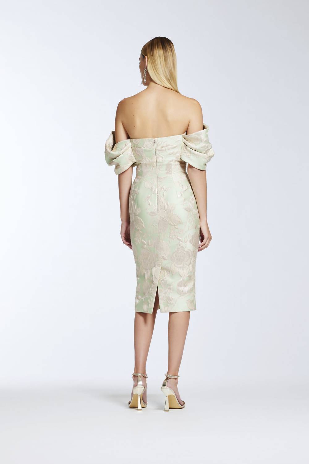 Just add a cute little clutch and a matching heel for the perfect event look. The Frascara 4442 is a chic knee-length dress in a mint hue, crafted from luxurious jacquard material. Designed with a fit and flare silhouette, it features a square neckline and short sleeves, adorned with a delicate floral appliqué for added depth. A discreet back zipper ensures a flawless fit, embodying a perfect blend of modern grace and boho chic style.
