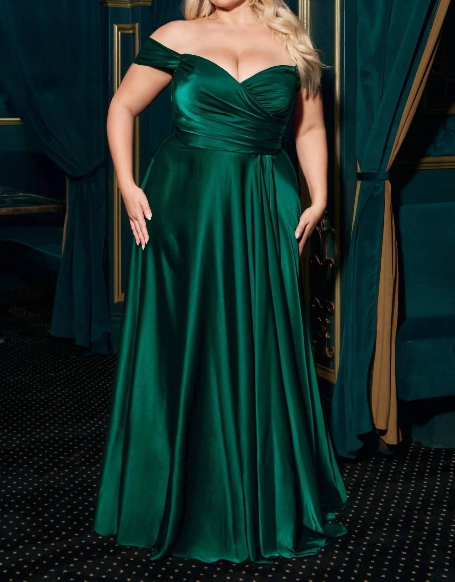 Just add a cute little clutch and a matching heel for the perfect event look. Step into the spotlight in the Off Shoulder A-line Satin Gown by Cinderella Divine, tailored for an elegant entrance. This emerald gown features off-the-shoulder short sleeves with a flattering sweetheart neckline and an open back secured by a zip closure. The floor-length A-line silhouette includes a side leg slit and a sweep train, offering both sophistication and ease of movement. Designed from luxurious satin, this fully lined gown is a timeless choice for any evening event.