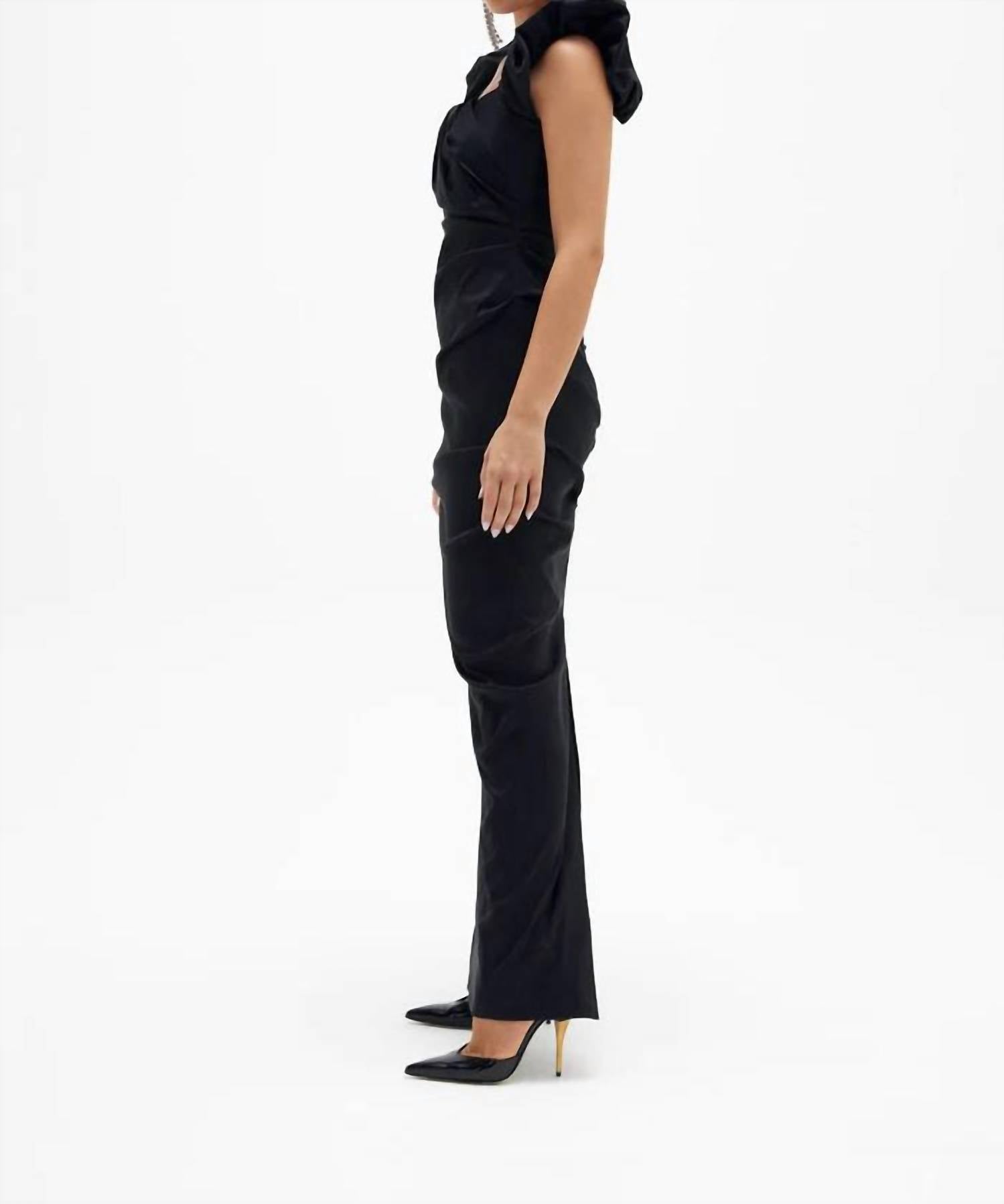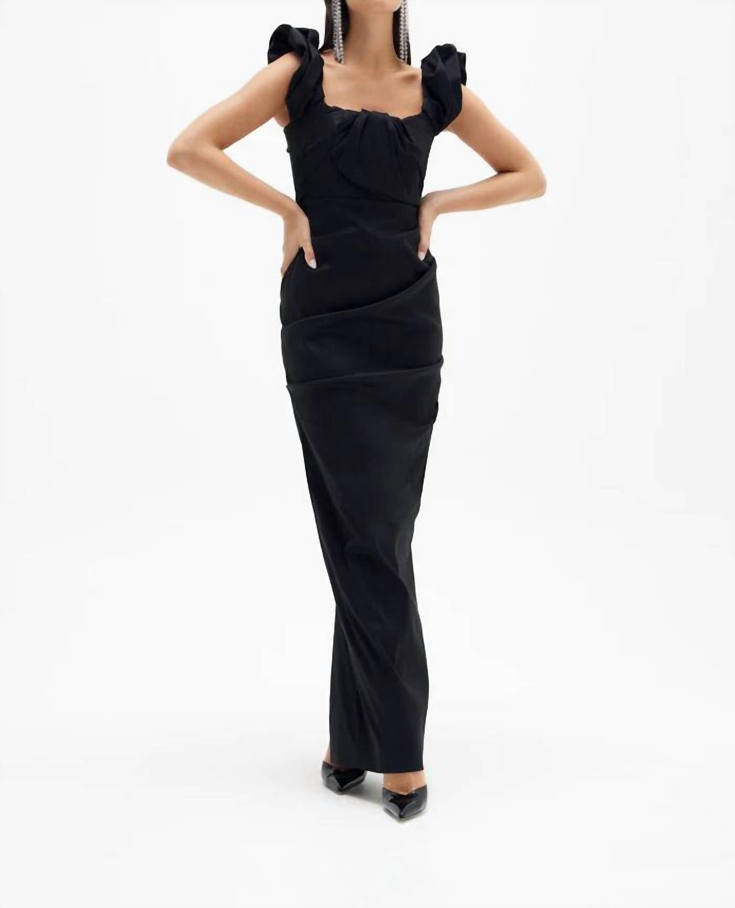 Timeless and sophisticated piece perfect for formal occasions. Sleeveless, form-fitting bodycon gown. Features a unique ruched taffeta with a light sheen and versatile statement sleeves. Crafted from 100% silk. Square neckline design. Easily secure it with its zip closure. Ensures a true-to-size fit and comfort. Care for this elegant classic with dry clean only instructions.