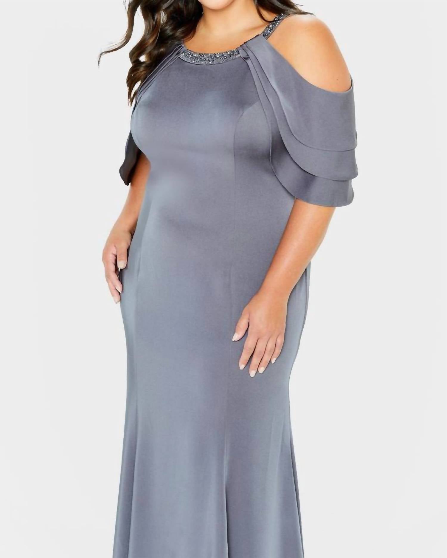 Just add a cute little clutch and a matching heel for the perfect event look. Introducing the Cold Shoulder With Tiered Sleeves Gown by Montage by Mon Cheri, an elegant choice for prom in a sophisticated charcoal shade. This stunning gown features short sleeves, crafted from a luxurious blend of beading and crepe, and showcases a scoop neckline that beautifully frames the face. With a flattering natural waistline, the trumpet skirt flows into a graceful sweep train, creating an unforgettable silhouette. Designed with a zip closure for a seamless fit and finished with a minimalist aesthetic to ensure timeless appeal.