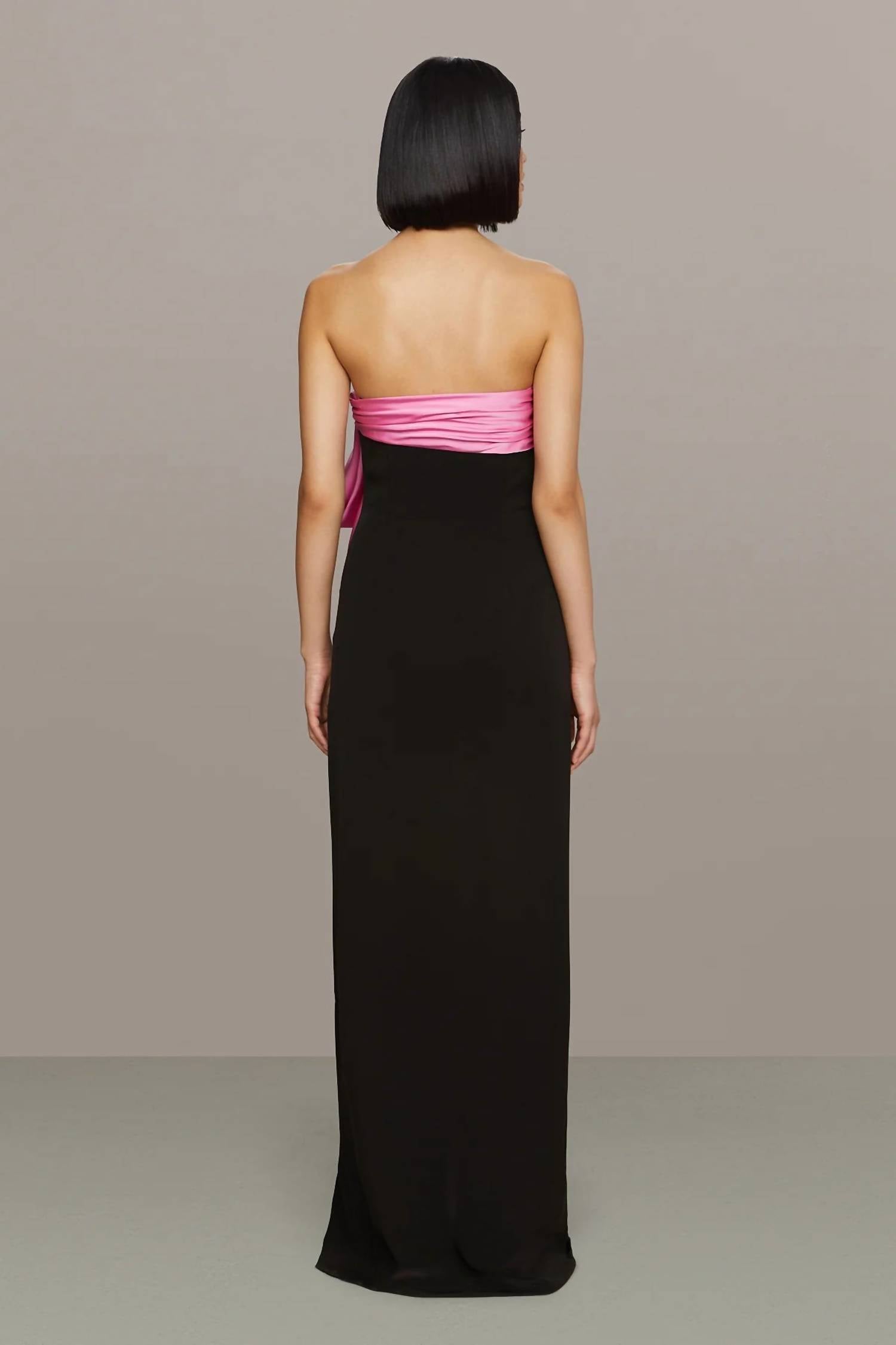 Just add a cute little clutch and a matching heel for the perfect event look. Step into your next event with the Melodie Bow Gown by AMUR, a striking pink and black column silhouette crafted for a sophisticated, minimalist look. This strapless gown offers a slight stretch with its 92% recycled polyester and 8% spandex composition, providing comfort and a snug fit through its hidden corset. Made with care and fully lined for support, this imported floor-length dress measures 63.25" in length. Ensure it remains a timeless piece by dry cleaning only, perfect for a standout spring appearance.