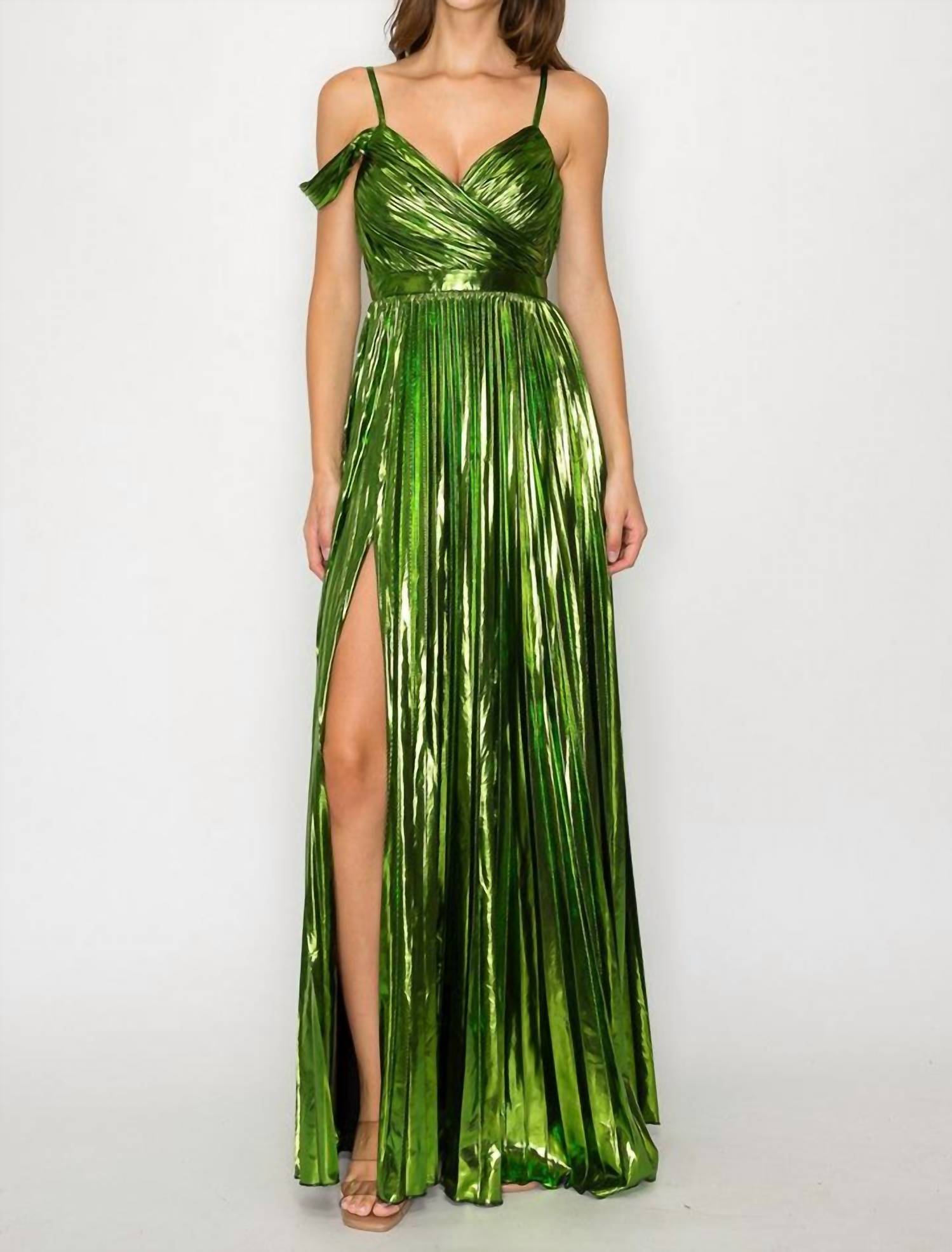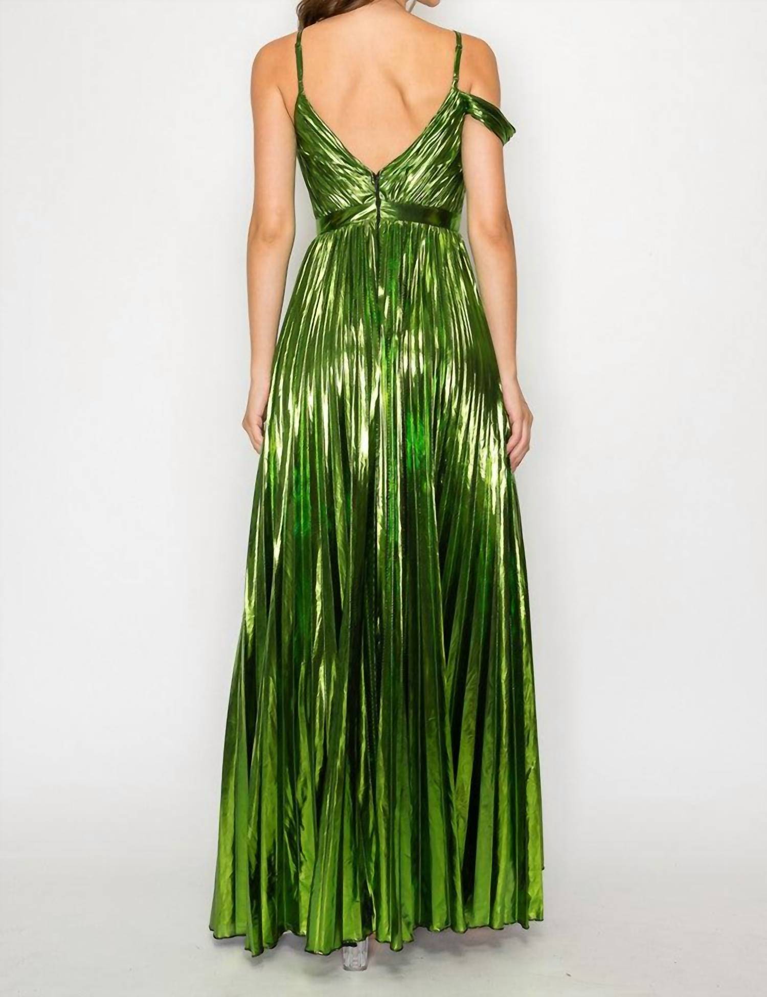 Just add a cute little clutch and a matching heel for the perfect event look. Shimmer in the Metallic Party Dress by Minuet, crafted for an elegant evening look. This women's dress, perfect for prom and special occasions, features sleek spaghetti straps and an empire waist silhouette. Designed with a solid green hue, this party essential boasts a flattering V-neckline. Closure: Zip closure.