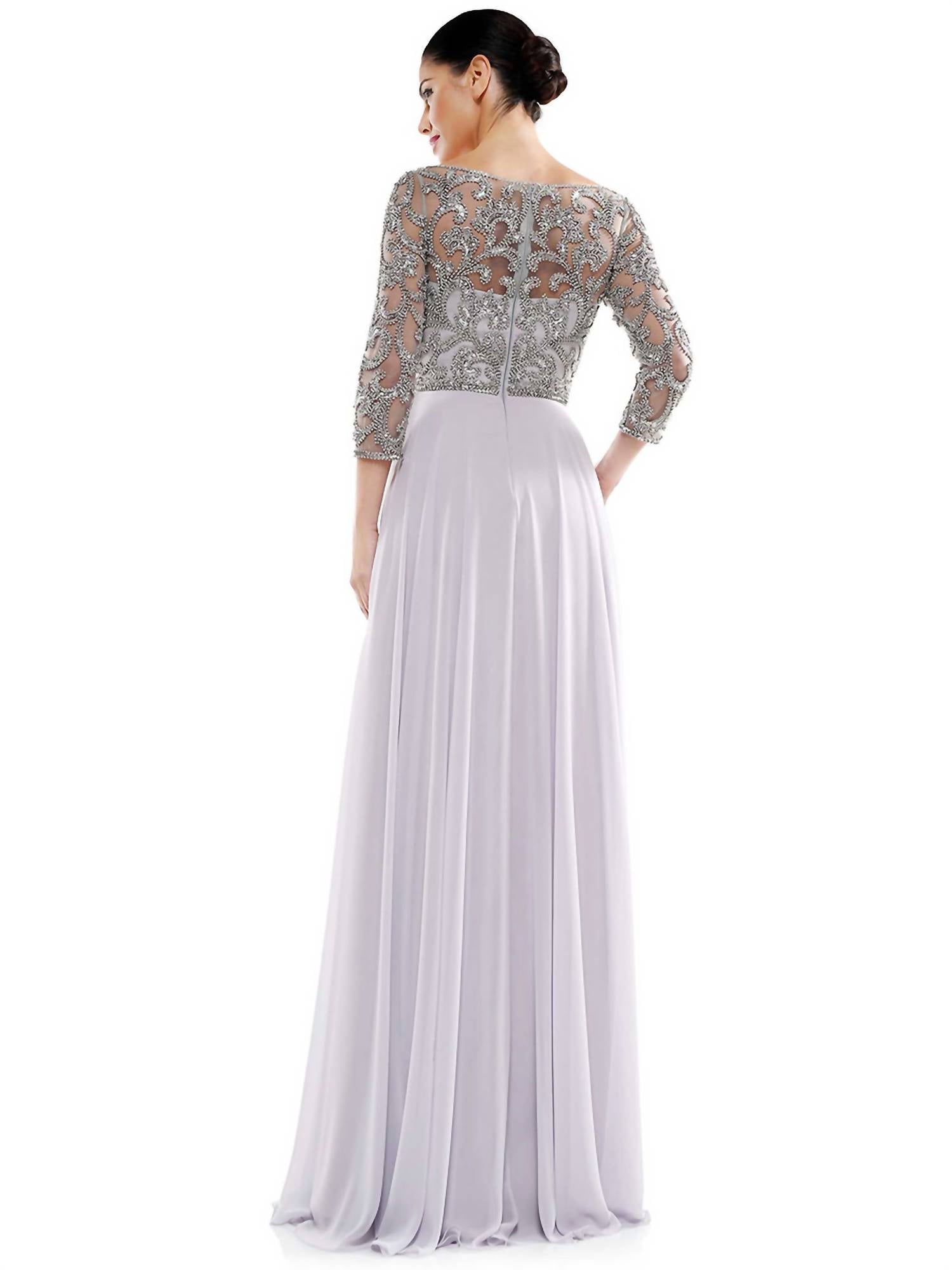 Marsoni by Colors presents the elegant Beaded Applique Chiffon Dress, a perfect choice for prom with its sophisticated design. This full-length A-line dress is fabricated from exquisite chiffon and features a stunning beaded applique detail. Sleeve Length: Three-quarter sleeve. Neckline: V-neck. Closure: Back zip. Ideal for adding a touch of glamour to any special occasion.