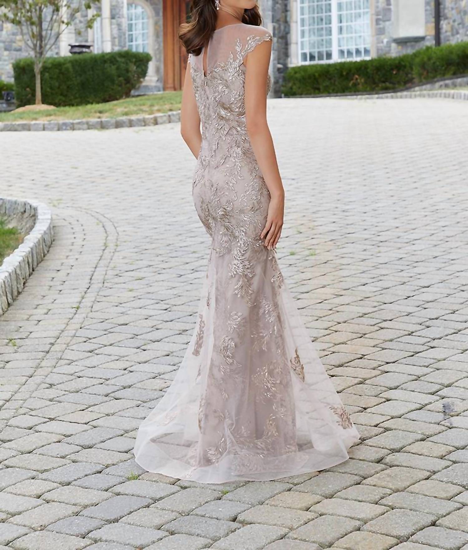 Just add a cute little clutch and a matching heel for the perfect event look. Elevate your evening elegance with the Sheer Neckline Sequin Dress by MGNY, meticulously crafted for stylish sophistication in taupe. This stunning gown features delicate cap sleeves and a breathtaking boatneck, adorned with glimmering sequined lace appliqués throughout. Designed in a mermaid silhouette, it promises a flattering fit for any special occasion. Zip closure.
