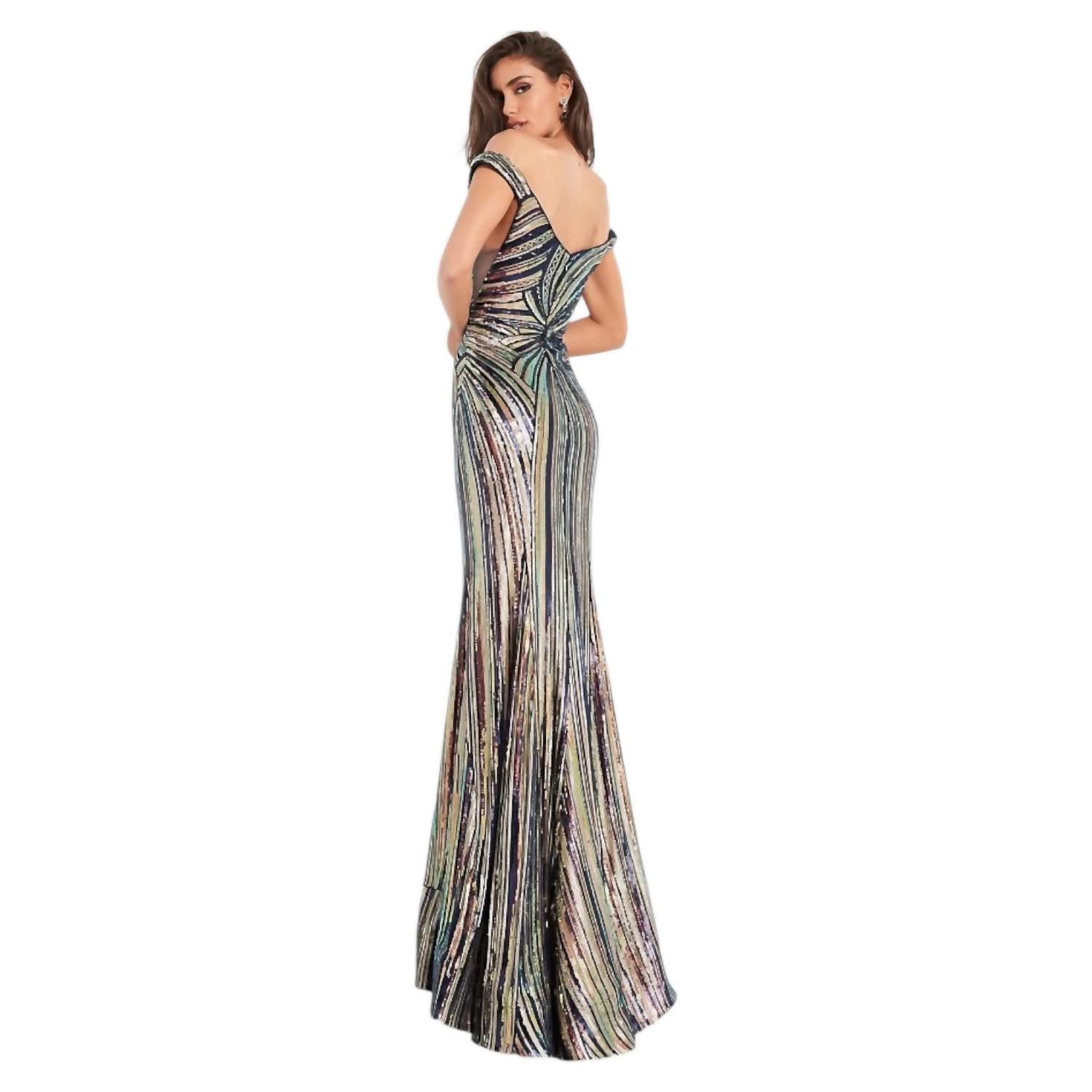 Introducing the Off-the-Shoulder Mermaid Dress by JOVANI, an exquisite choice for making a stunning entrance at any formal occasion. This sleeveless prom dress in a captivating black-multi color features dazzling sequin embellishments that beautifully highlight its patterned elegance. Designed with an off-the-shoulder neckline and a glamorous mermaid silhouette, it ensures you'll be the center of attention. Closure Type: Zip closure. Perfect for evening events, formal gatherings, or as a mother of the bride outfit, this dress combines elegance with effortless style.
