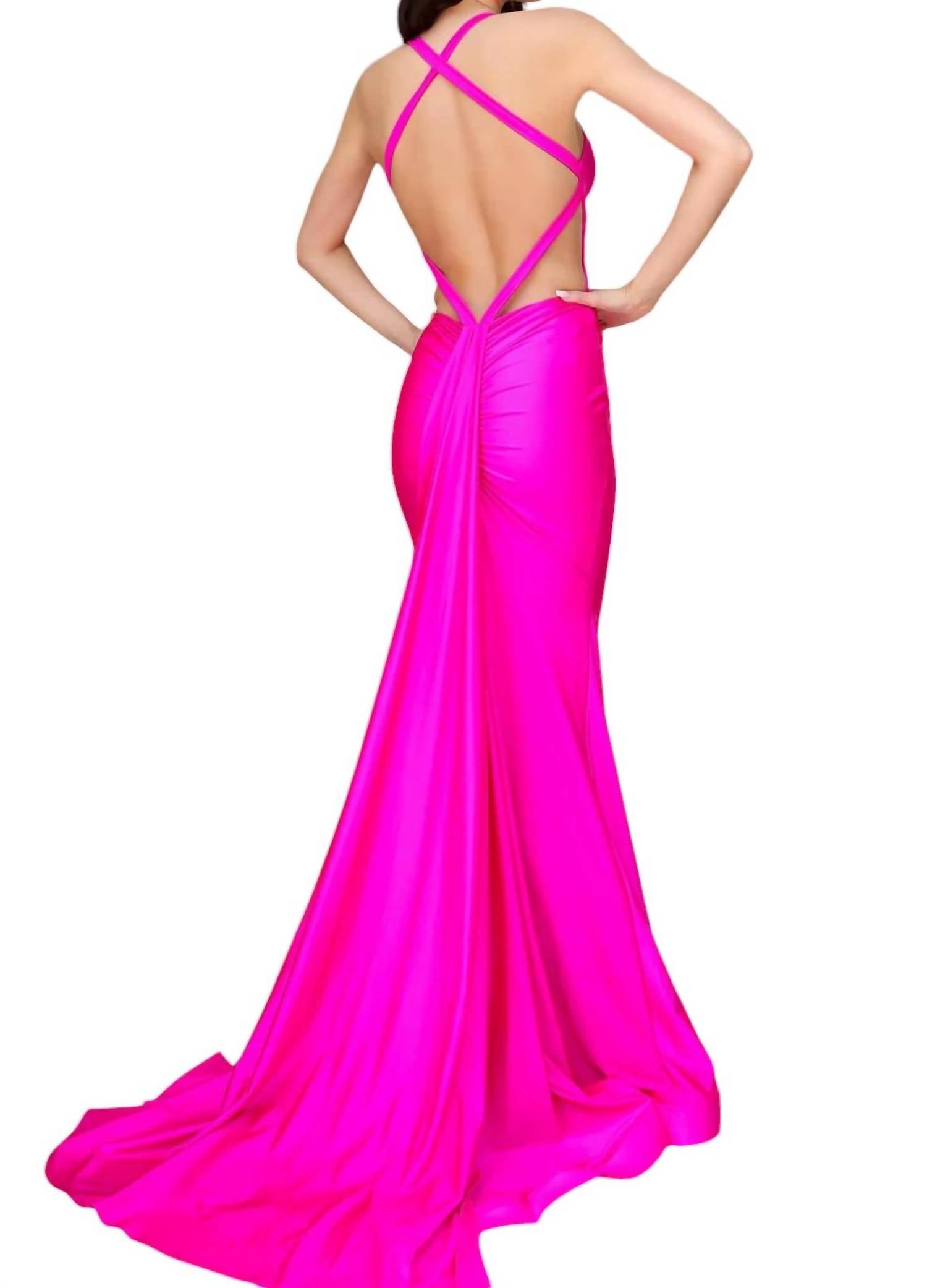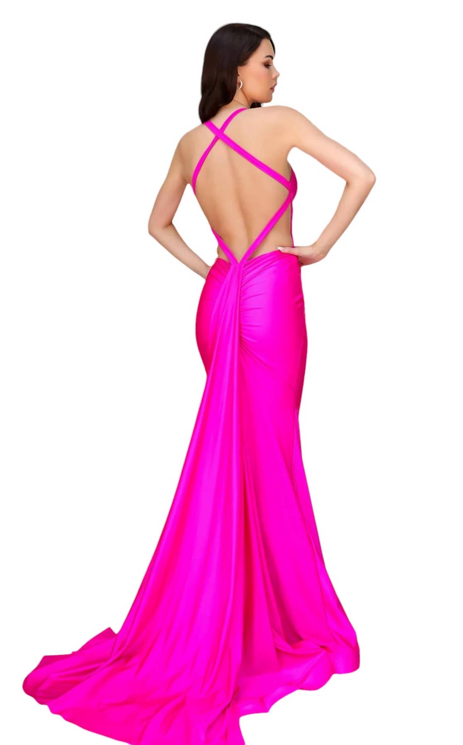 This stunning mermaid gown is made from luxurious jersey fabric, featuring a deep V-neckline and sleeveless design with delicate straps. The fitted silhouette is enhanced by a ruched back and crisscross straps, leading to an open, sultry back. A sweeping train with a horsehair hem adds dramatic flair to the long-length design, perfect for making a captivating entrance.