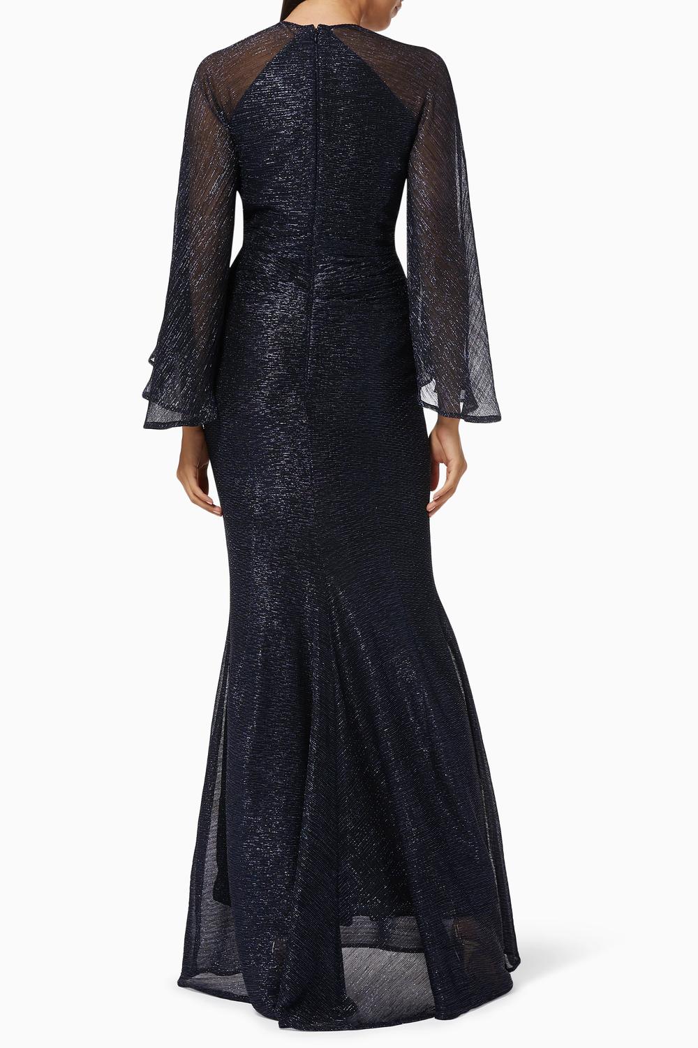 Looking for that perfect event dress? Look no further... Presenting the Conley 2 Midnight Pleats Long Dress by Talbot Runhof, an exquisite choice for your evening events in a striking Nautical Blue. This elegant dress features long, slightly transparent raglan trumpet sleeves and a sophisticated V-neckline, complemented by a front draping and a mermaid silhouette that is slightly fitted at the waist. Expertly crafted in Germany, the dress is composed of 55% polyester and 45% metal, ensuring a textured finish with metallic pleats. Closure is provided by a secure zip fastening, and it requires dry cleaning for optimal care.
