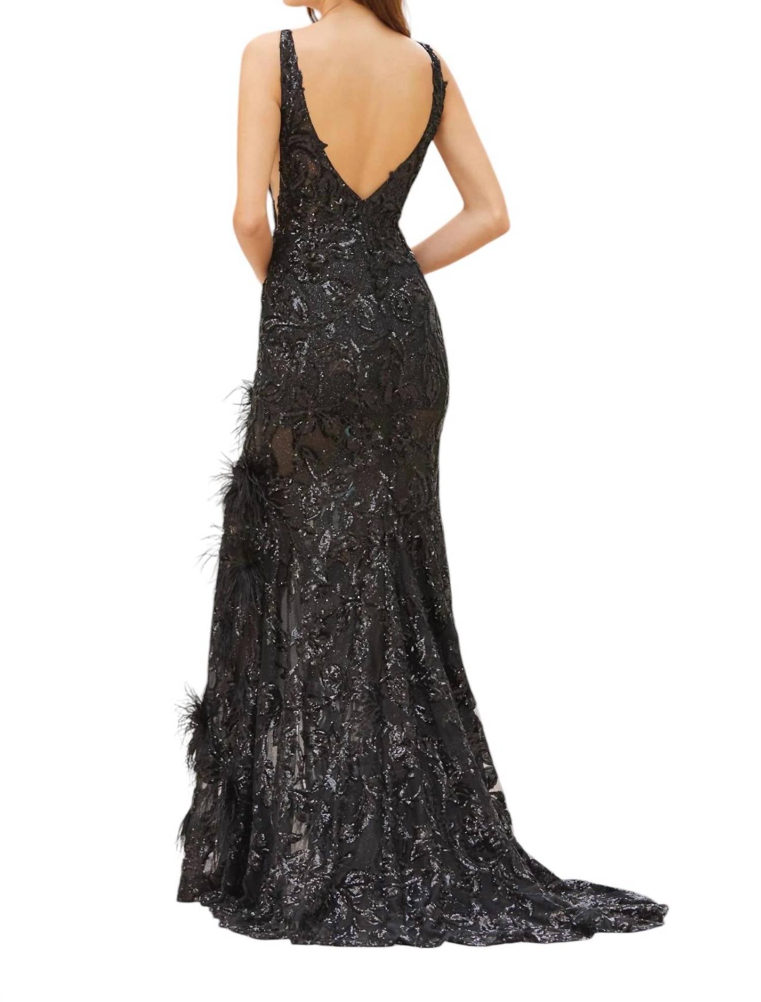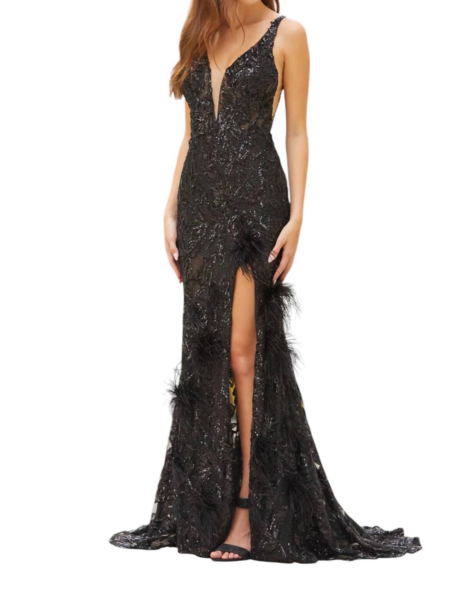 The Feathered Sequined Evening Gown is a breathtaking choice for those seeking elegance with a touch of drama. This machine-embroidered sequin gown showcases a deep V-neckline and a striking feather-embellished skirt slit, which is beautifully complemented by a plunging V-neckline at the back. The front slit allows for eye-catching movement, while the feather details add an extra layer of sophistication. Adorned with lace embroidery that features a shimmery finish, this gown exudes an overall elegant look. The sweeping train at the back is perfect for making a dramatic grand entrance, and a back zipper ensures ease of wear.