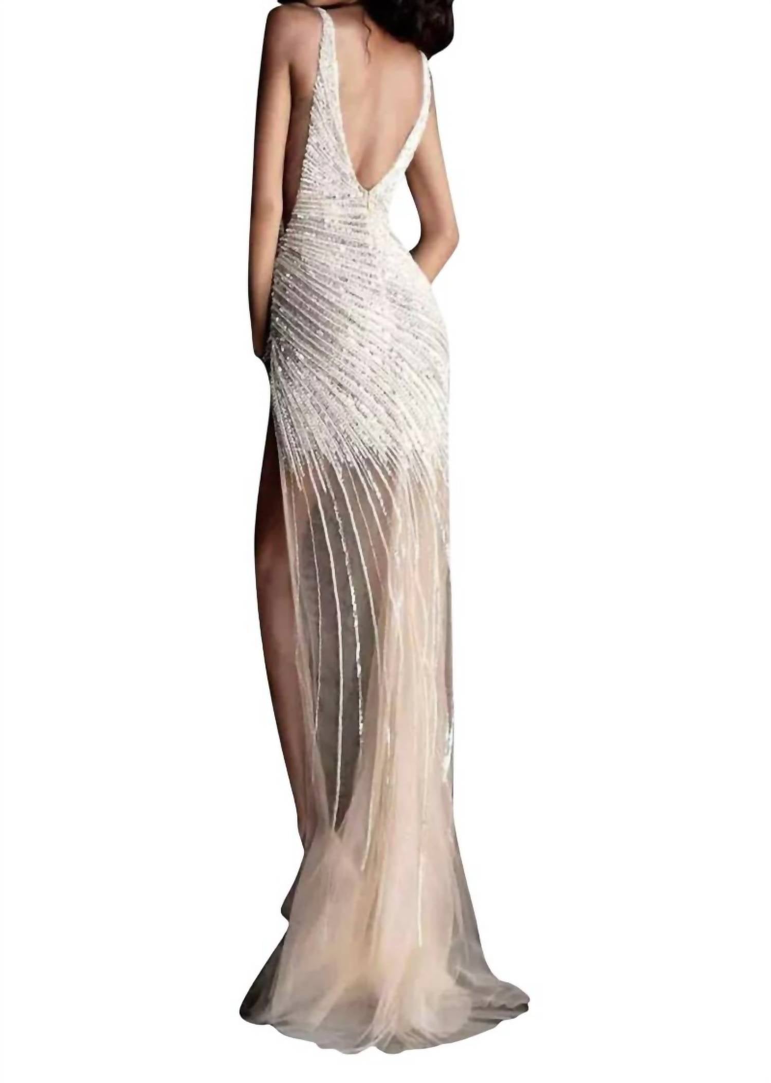 Looking for that perfect event dress? Look no further... Embrace glamour with the High Slit Beaded Prom Dress by JOVANI, a stunning choice for your special occasion. This sleeveless gown features a fit and flare silhouette with intricate textured beading in a luxurious gold/silver design. The V-neckline adds a touch of elegance, while the zip closure ensures a secure fit. Care instructions include dry clean and line dry, ensuring your dress remains pristine.