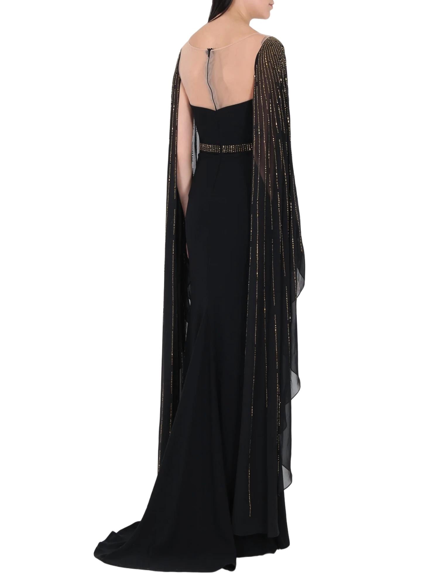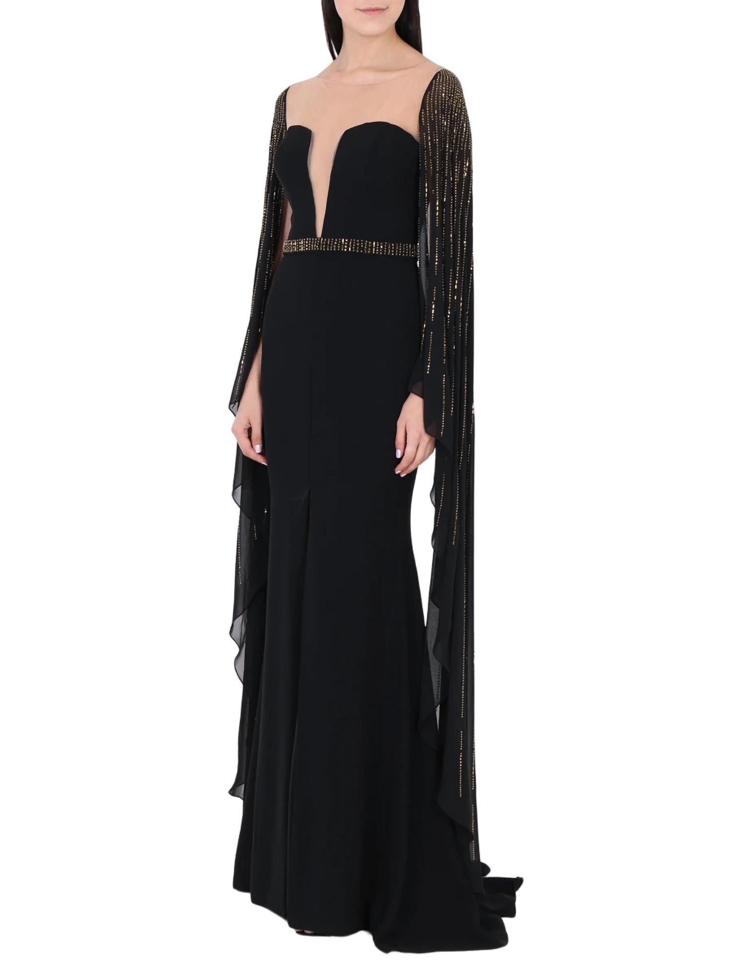 Looking for that perfect event dress? Look no further... Full-length evening maxi dress with a train, open dropped shoulder line and neckline, V-neckline and round neckline on transparent mesh, long flowing batwing sleeves, embroidered narrow belt in the same tone as the sleeves to emphasize the waist, fitted silhouette, and slit from the hip. 100% Polyester.