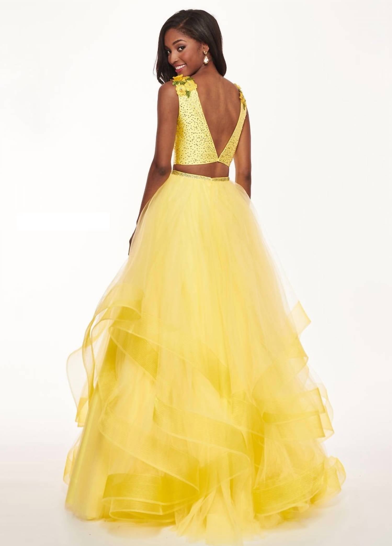Turn heads in the cutest and most flattering evening dress. Exude elegance at your next prom with the Two-piece Embellished Tulle Gown by RACHEL ALLAN. This sleeveless, A-line silhouette gown in radiant yellow features a V-neck front with a mesh inset and a V-back, beautifully adorned with embellishments on the bodice and waist. The luxurious ruffled tulle ball gown skirt ensures you make a statement. Closure: Zip closure. Perfect for a memorable prom night.