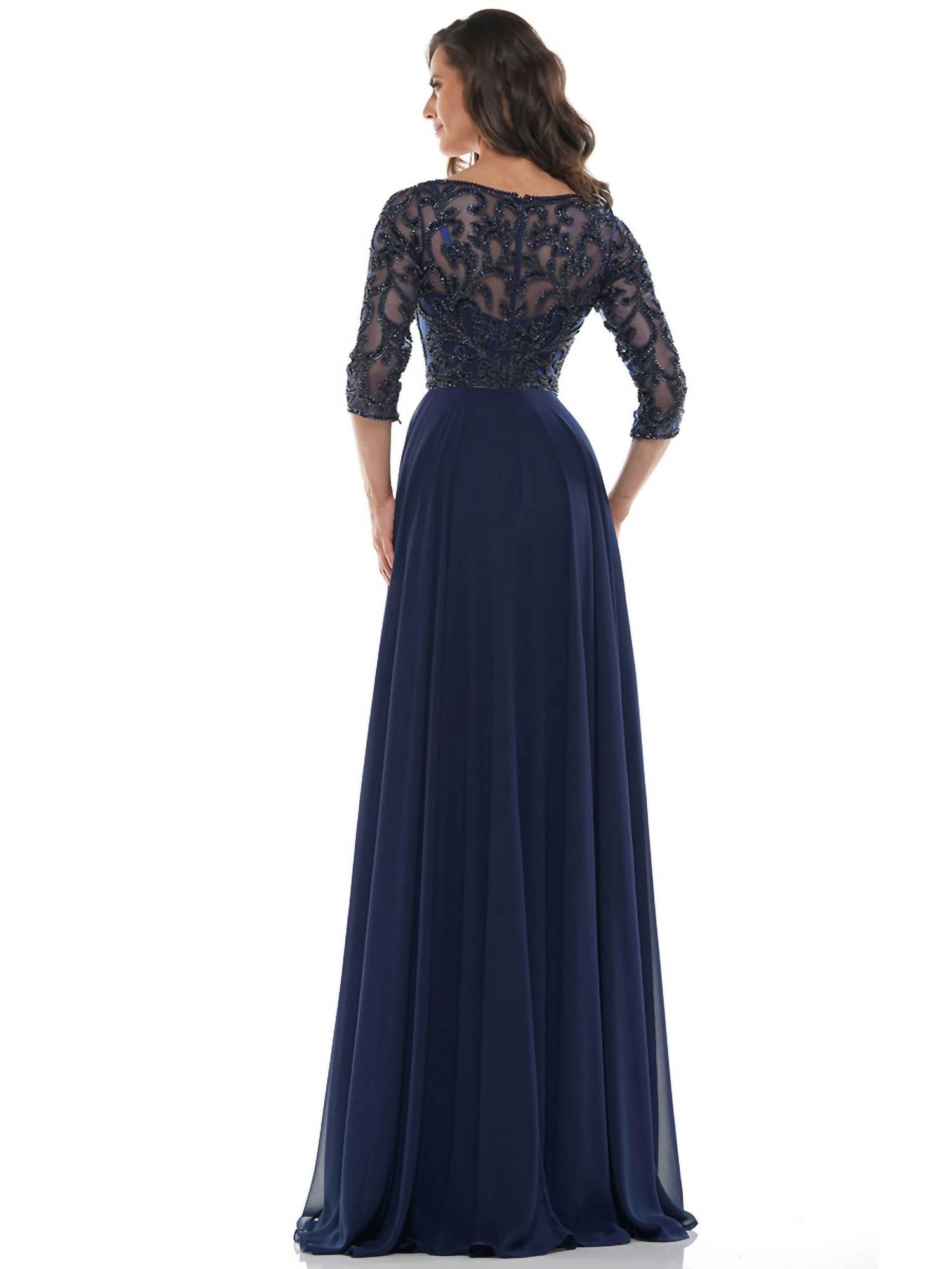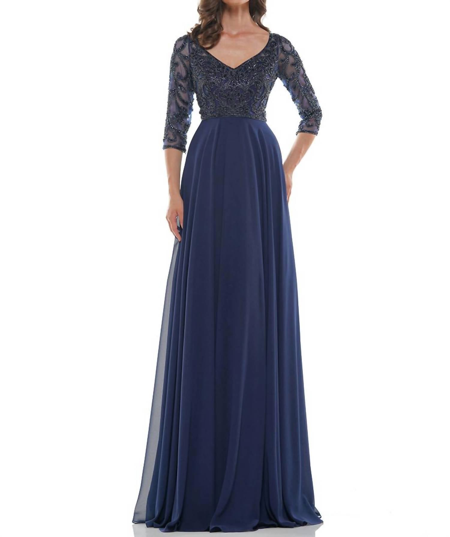 Marsoni by Colors presents the elegant Beaded Applique Chiffon Dress, a perfect choice for prom with its sophisticated design. This full-length A-line dress is fabricated from exquisite chiffon and features a stunning beaded applique detail. Sleeve Length: Three-quarter sleeve. Neckline: V-neck. Closure: Back zip. Ideal for adding a touch of glamour to any special occasion.
