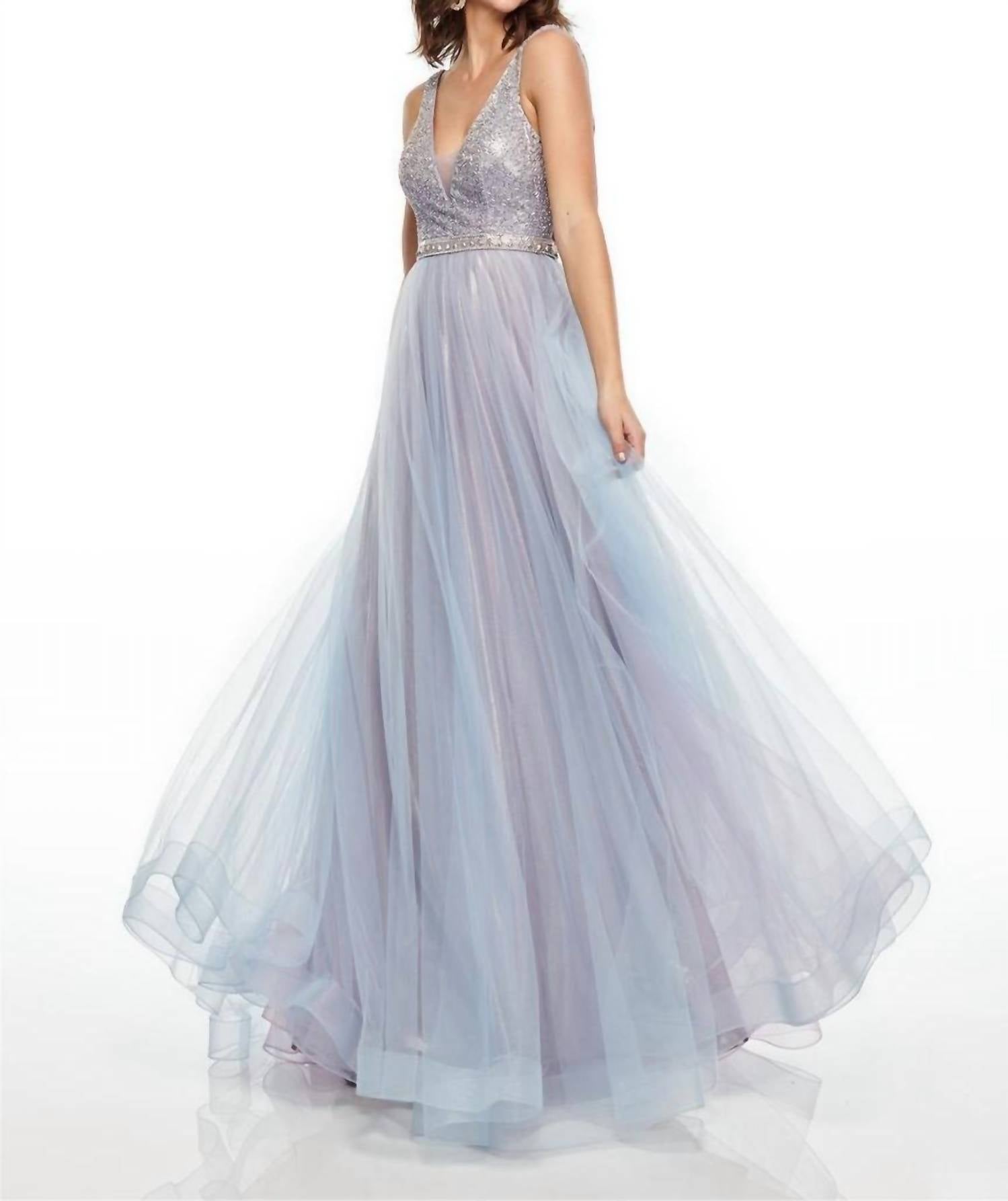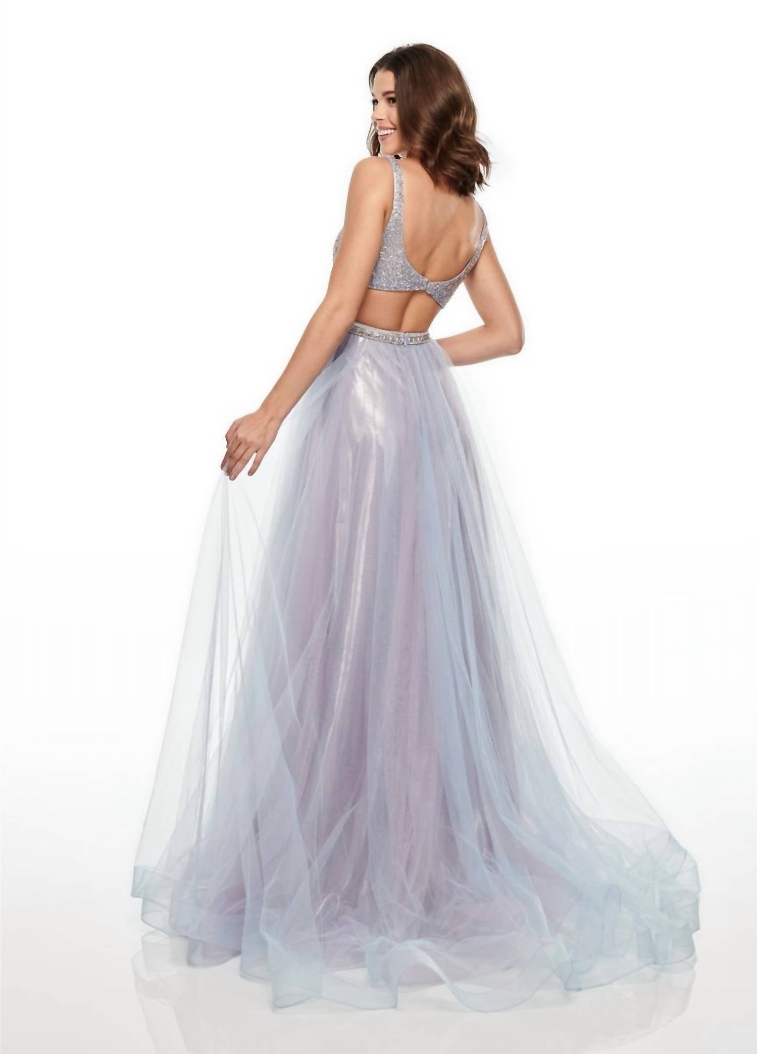 Just add a cute little clutch and a matching heel for the perfect event look. Step into elegance with the Tulle A-line Prom Gown by RACHEL ALLAN, crafted in a captivating lilac and powder blue hue. This sleeveless gown dazzles with tone-on-tone and AB stones, featuring a V-neck with a mesh inset and a stylish back cutout. Made for prom perfection, its silhouette promises to flatter your figure. Closure: Zip closure.