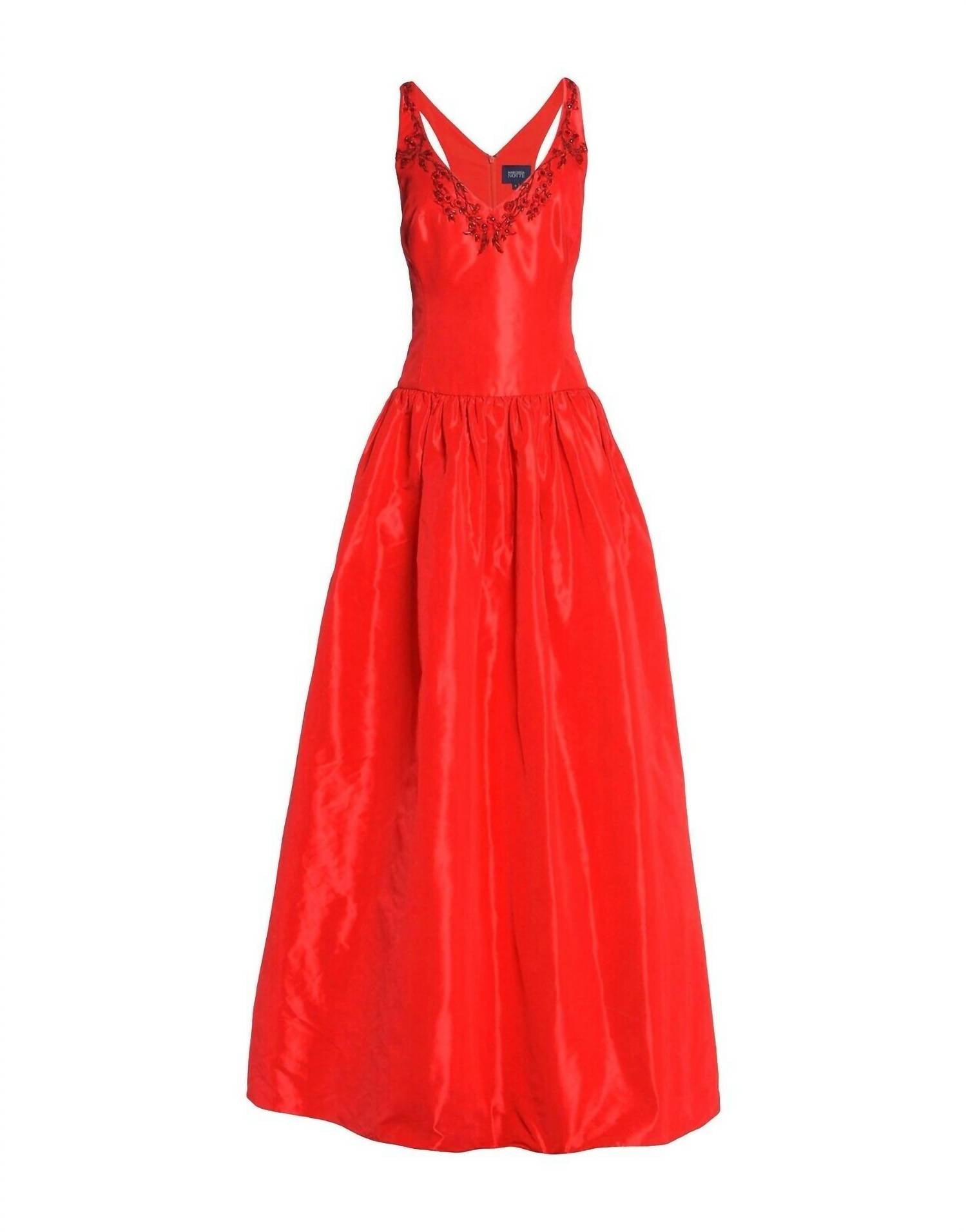 Introducing the Marchesa Taffeta Satin Ball Gown Embellished Dress, a show-stopping piece perfect for any special occasion. This stunning sleeveless gown features a deep V-neckline adorned with rhinestones, exuding elegance and glamour. Made from luxurious hot red taffeta, it is designed in a sophisticated empire waist silhouette and is fully lined for optimal comfort. With a back zip closure, this gown measures 57.72 inches in length from the back to the bottom, promising a graceful and flowing fit.