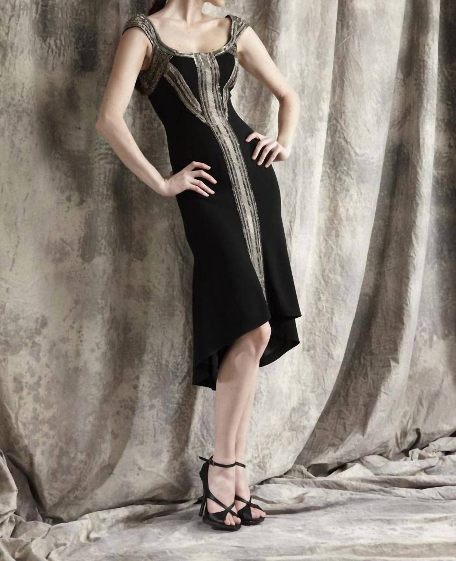 Theia - Scoop Neck Mixed Bead Trim Detail High Low Crepe Dress