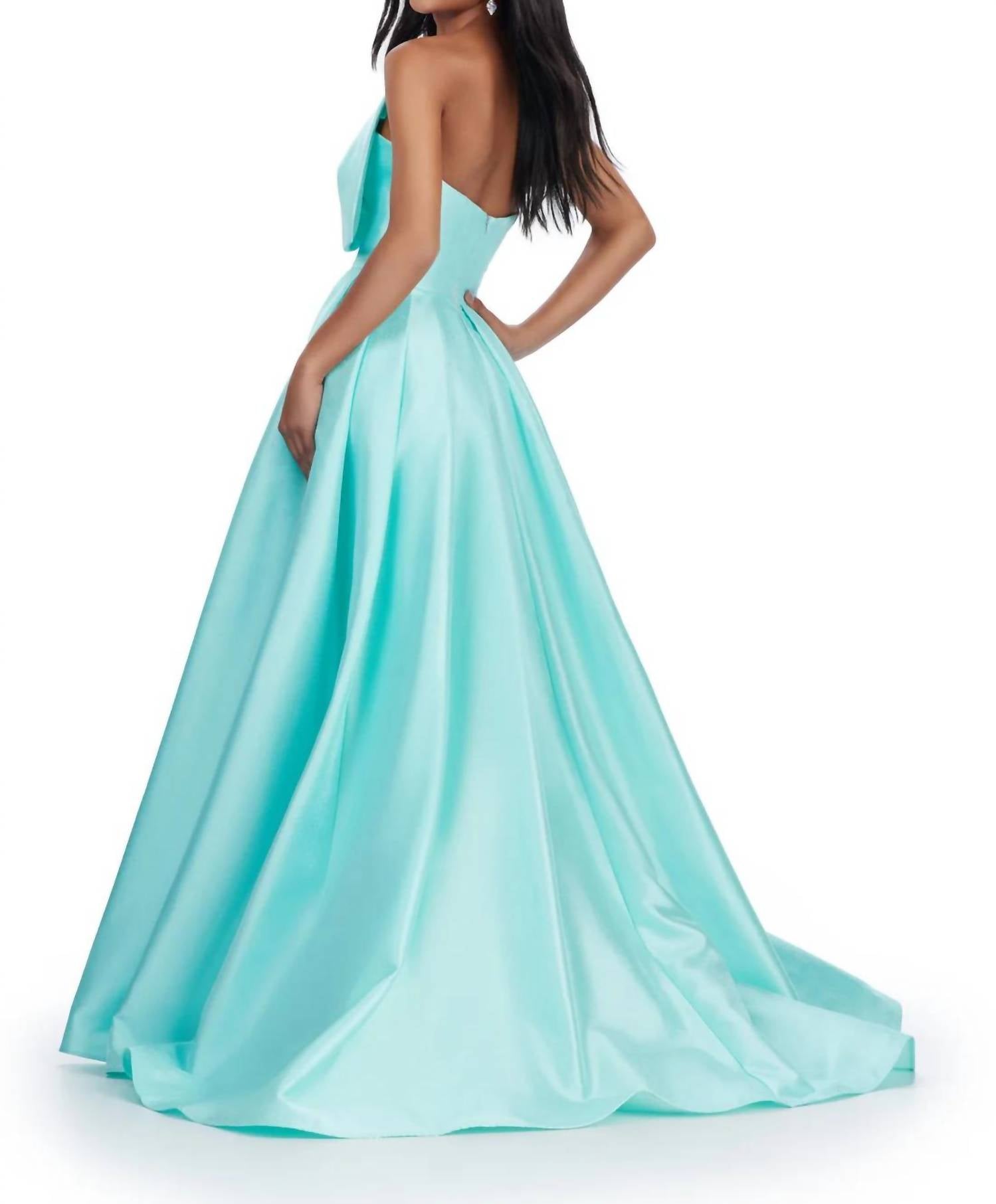Turn heads in the cutest and most flattering evening dress. This strapless design is made from sleek mikado fabric and showcases a v-neckline with an illusion inset at the center. The asymmetrical oversized bow detail embodies extravagance, while the mid-open back has a convenient zipper for a secure and flawless fit. With a high slit allowing glimpses of your legs, the wrap-style skirt creates a ballgown silhouette as it reaches the sweeping train.