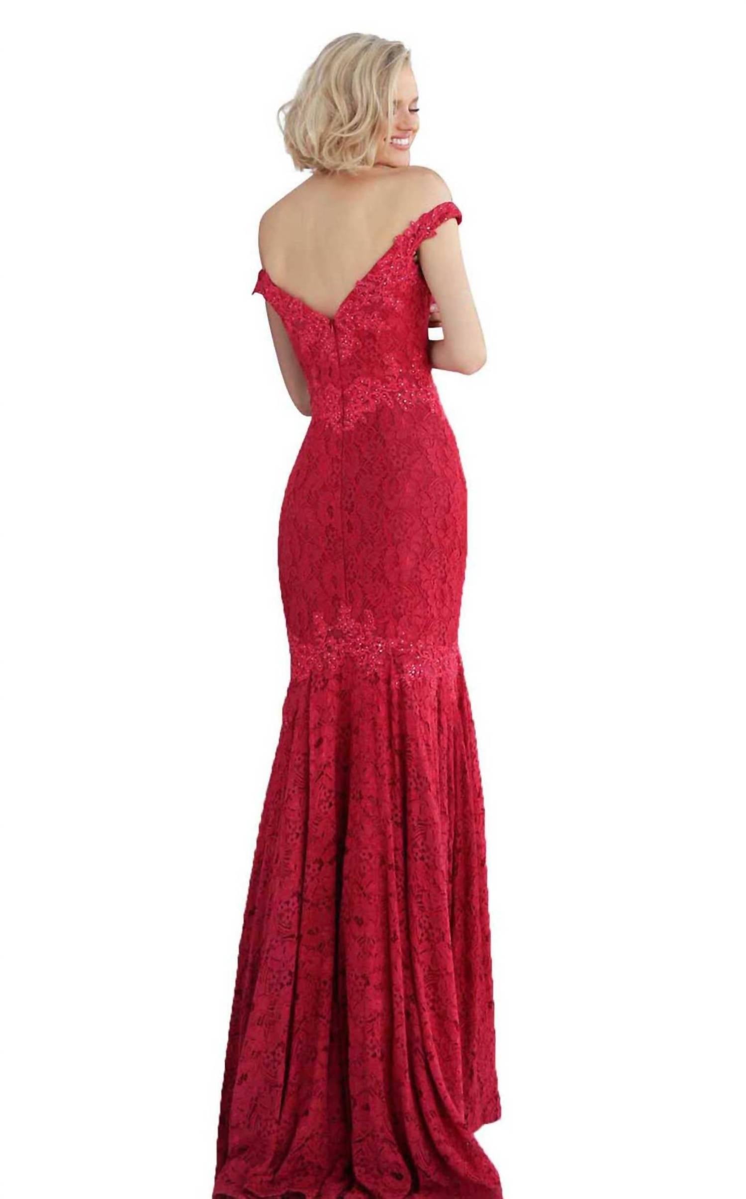 Step into the spotlight at prom with the JOVANI Embellished Lace Off-Shoulder Mermaid Dress. Featuring off-shoulder sleeves, this gown's exquisite lace fabric elegantly traces the contours of a fitted bodice down to a dramatic mermaid skirt. A low V-back adds allure, while the back zip closure ensures a seamless fit. Perfectly embodying sophistication and glamour in vibrant red, this stunning long dress is engineered to enchant.