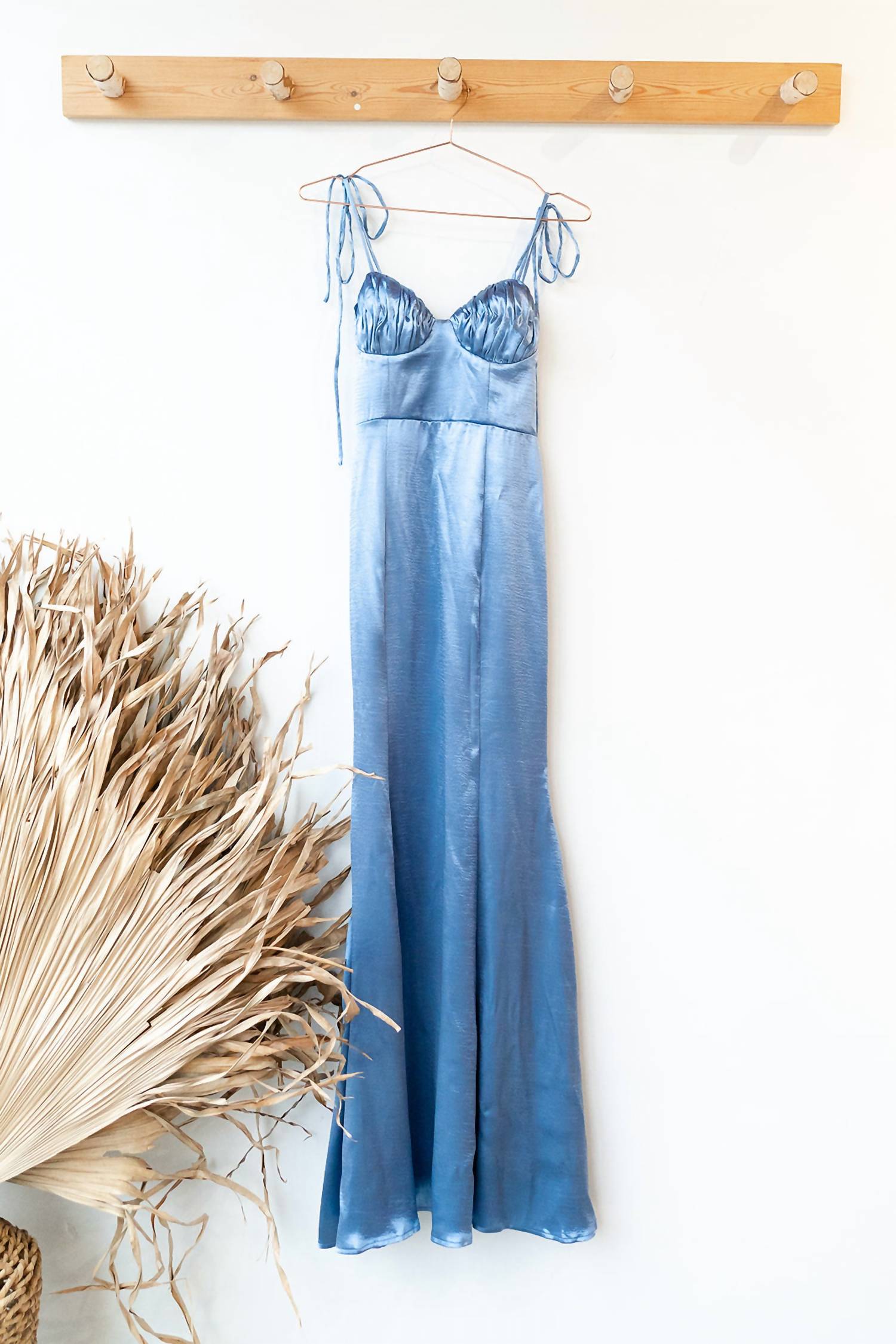 Just add a cute little clutch and a matching heel for the perfect event look. Must-have for your summer wardrobe in a stunning dusty blue. Sleeveless dress flaunts a minimalist, solid pattern with adjustable tie straps and a mermaid silhouette for a captivating prom look. Made with padded cups for comfort and featuring a back zip closure, it's lined for added structure. Dry clean is recommended. Perfectly fitted, the dress runs true to size, adding a touch of grace to any special occasion.