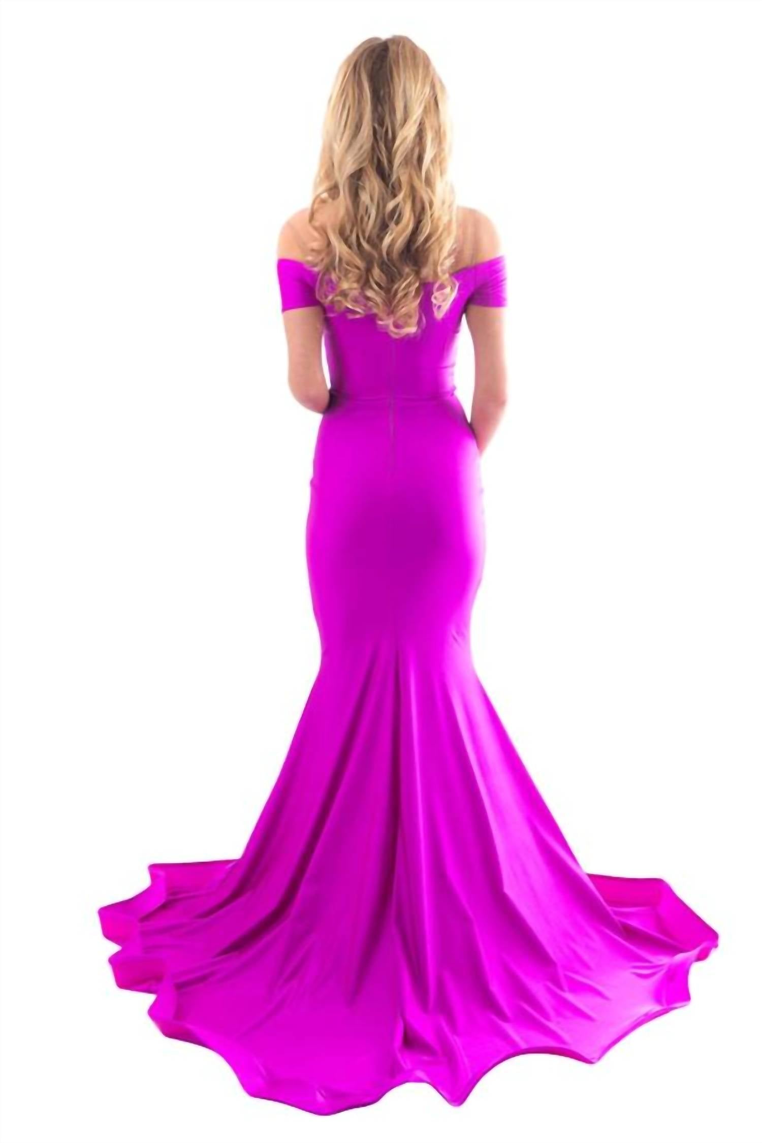 Looking for that perfect event dress? Look no further... Please see image 4 for minor defect. There is a small stain on the bottom of the dress. Elevate your prom look with the stunning Long Train Plunging Neckline Dress by JESSICA ANGEL, designed in a vivid fuchsia hue. This long, jersey gown embodies elegance with its off-the-shoulder neckline and short sleeves, perfect for making a stylish entrance. Featuring a fitted mermaid silhouette, it boasts a dramatic sweep train and a refined illusion inset for a touch of allure. The open back is complemented by a back zip closure, creating a seamless finish, while the horsehair hem ensures you glide effortlessly with every step.
