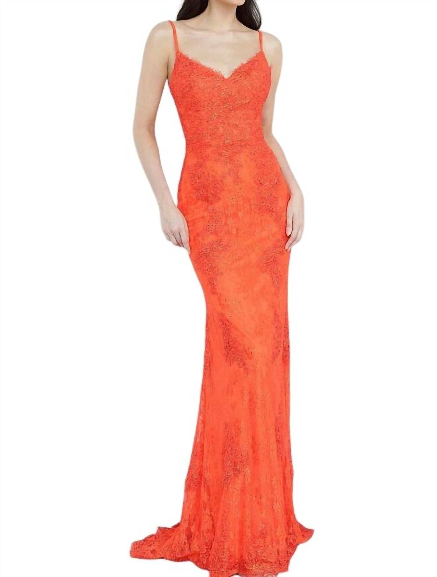 Introducing the Form Fitting Lace Prom Dress by JOVANI, a stunning sheath silhouette designed to make a statement. Featuring elegant beaded lace with spaghetti straps accentuating a shallow V-neckline and a mesmerizing low scoop back. This gown is completed with eyelash trims along all edges and a slight brush train for added sophistication. Closure: Back zip. Perfect for prom, this dress exudes glamour and style in a captivating Orange/Red hue.