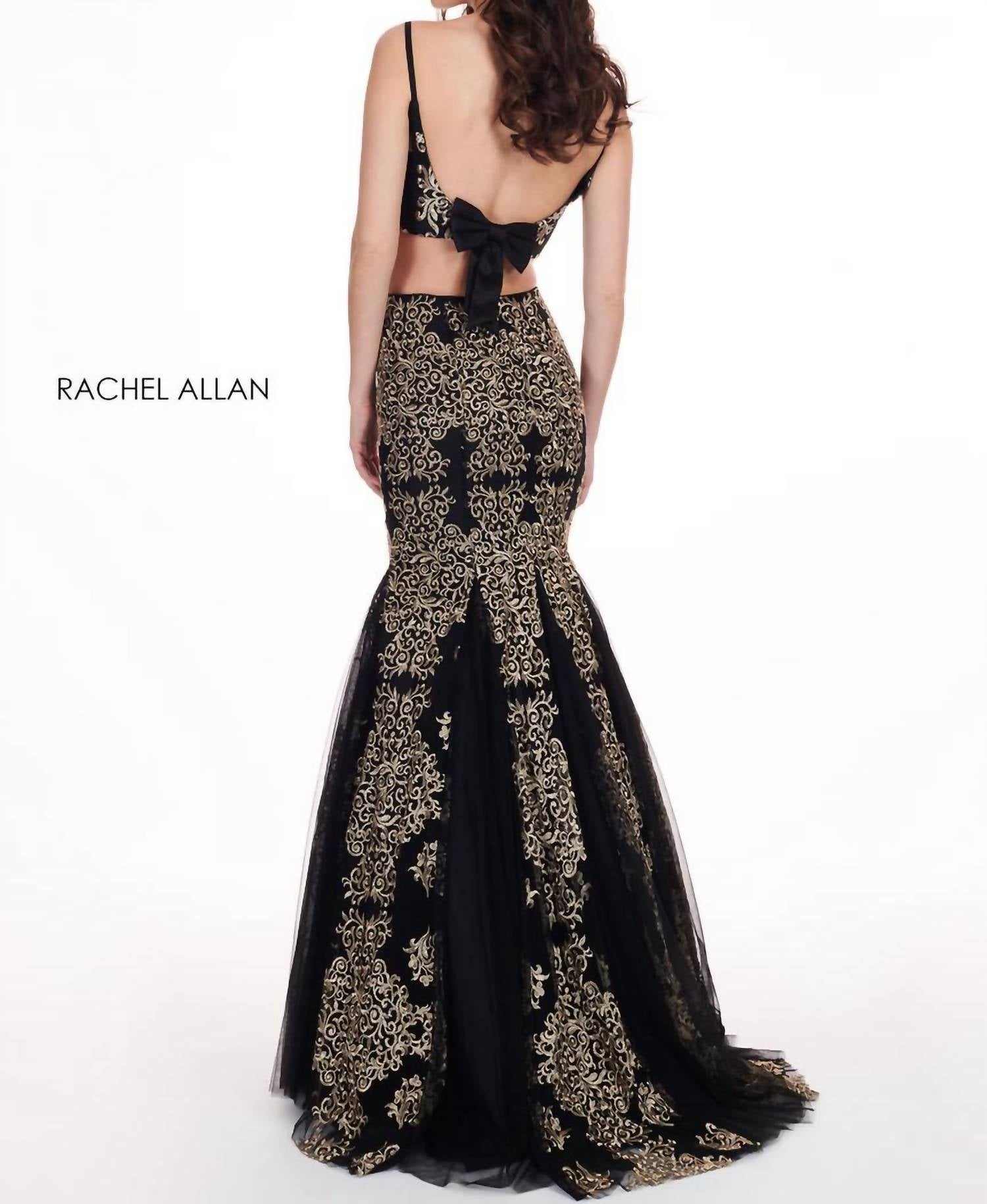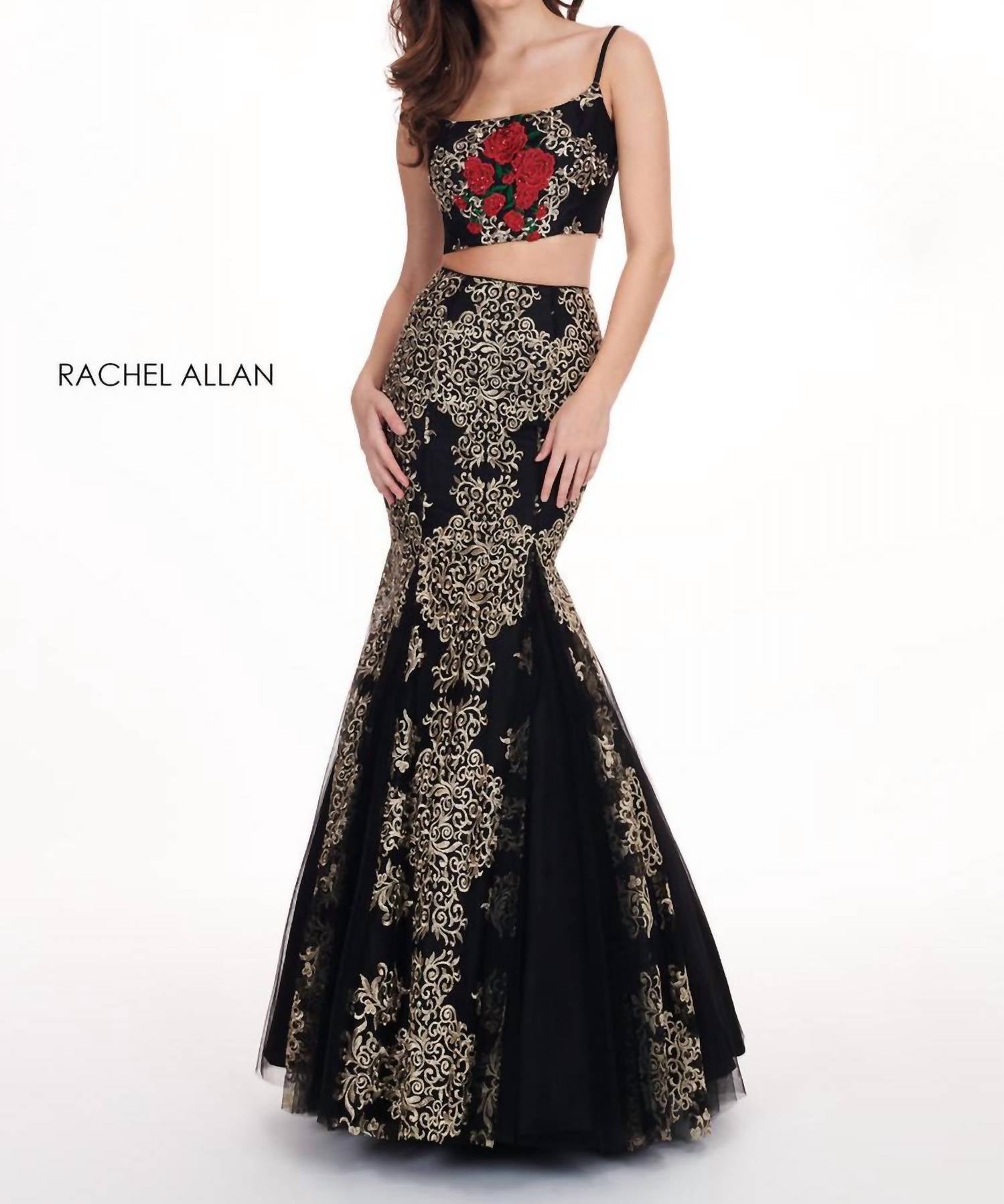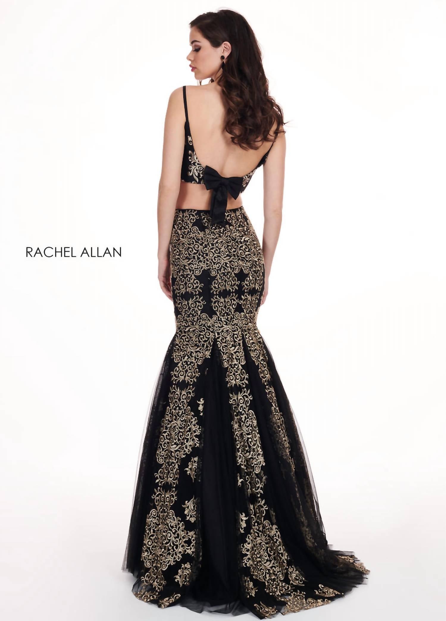 Turn heads in the cutest and most flattering evening dress. Step into elegance with the Two-piece Long Mermaid Gown 6560 by RACHEL ALLAN, perfect for any prom night. This gown features spaghetti straps and intricate rose embroidery, making it a standout piece. The tulle mermaid skirt adds a touch of drama with its ruffles and a charming self-tying bow at the back. The gown is full length and crafted from lace material, with a convenient zipper closure for a secure fit.