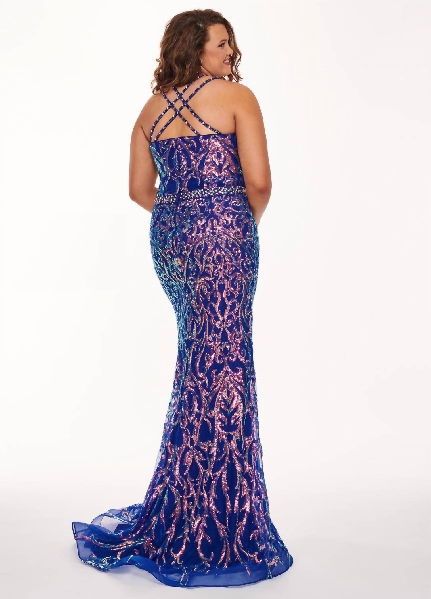 Looking for that perfect event dress? Look no further... Make a statement with the Sequin Halter Neck Prom Gown by RACHEL ALLAN, designed to captivate with its striking indigo iridescent hue. This sleeveless gown features a sheath silhouette enhanced by a dramatic train and a criss-cross strap back. It is beautifully embellished at the waist and secures with a zip closure. Perfect for prom, this gown showcases exquisite craftsmanship and style.