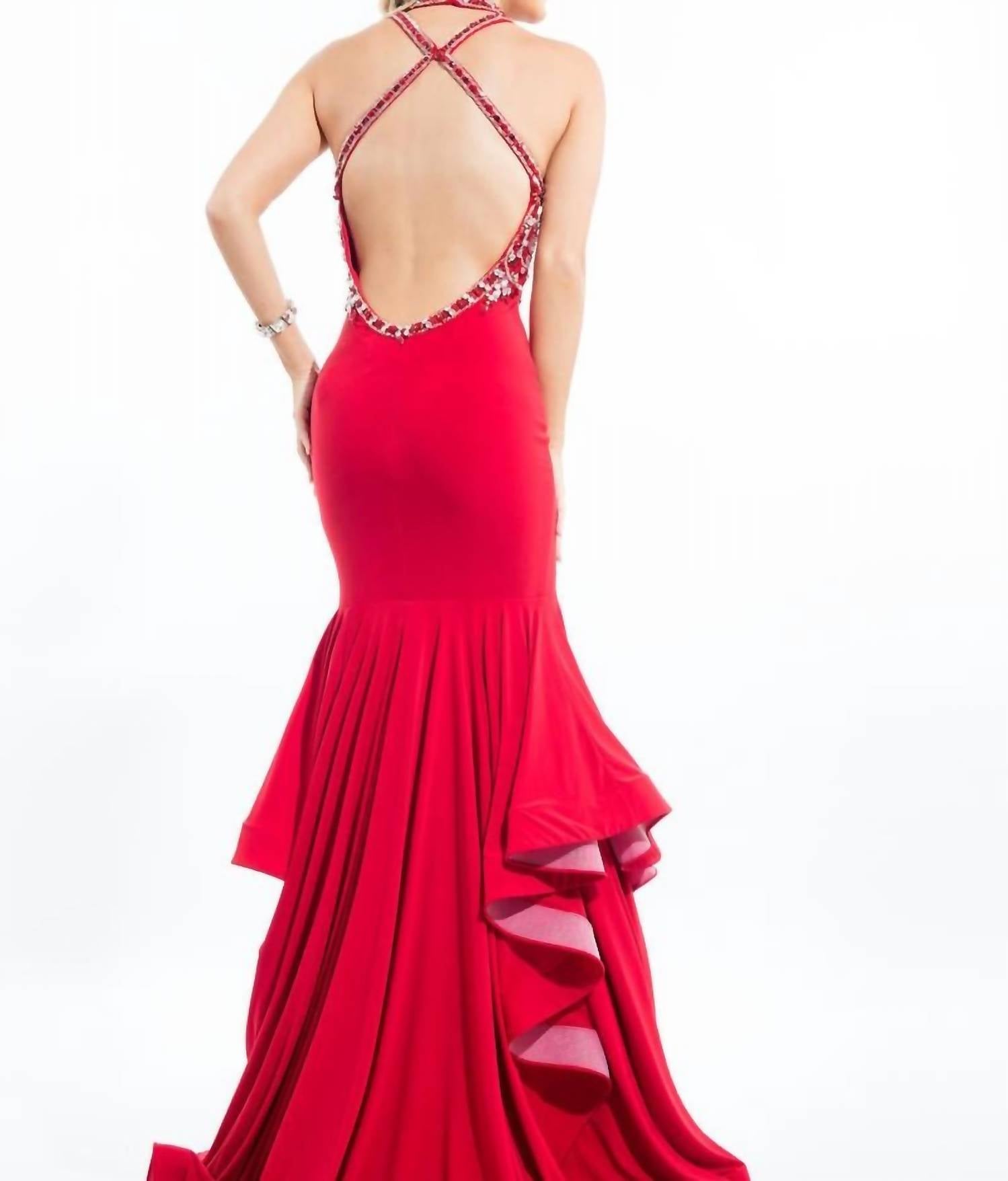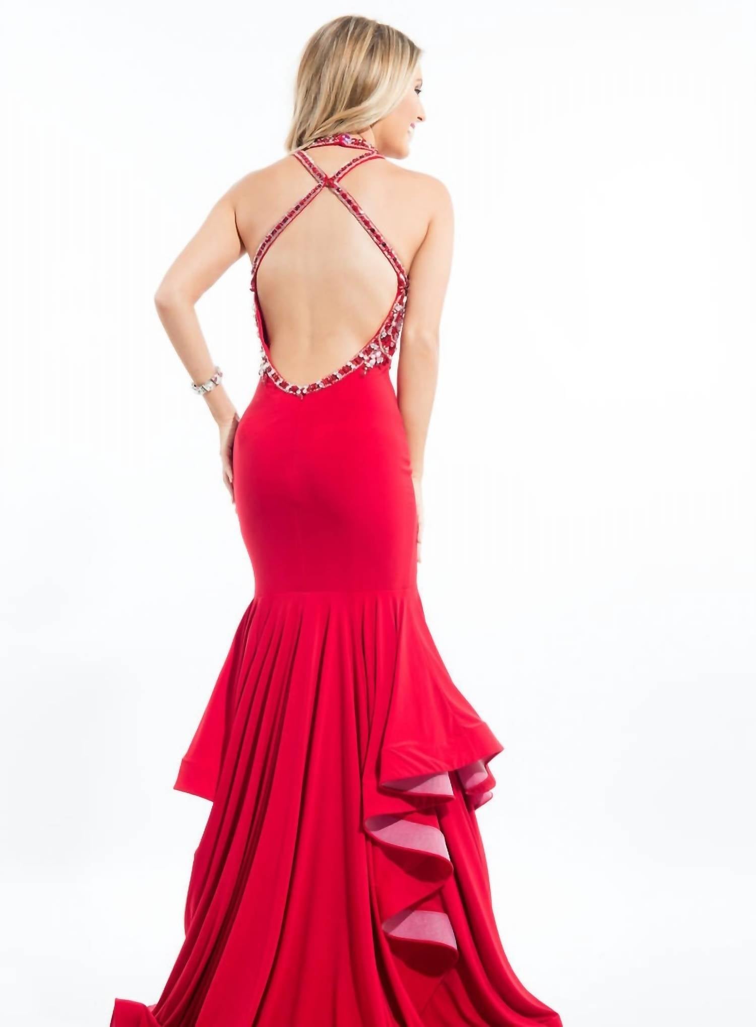 Looking for that perfect event dress? Look no further... The Beaded Halter Neck Jersey Prom Gown by RACHEL ALLAN is an elegant choice for any prom occasion. This sleeveless mermaid silhouette features exquisite beadwork on the bodice and straps, accompanied by a stylish cutout front and an open back. Crafted from luxurious jersey fabric, the gown also includes a ruffled skirt that adds a touch of drama. Closure is a convenient zip, ensuring a secure fit for a memorable evening. Perfect for women seeking a sophisticated and show-stopping look in vivid red.