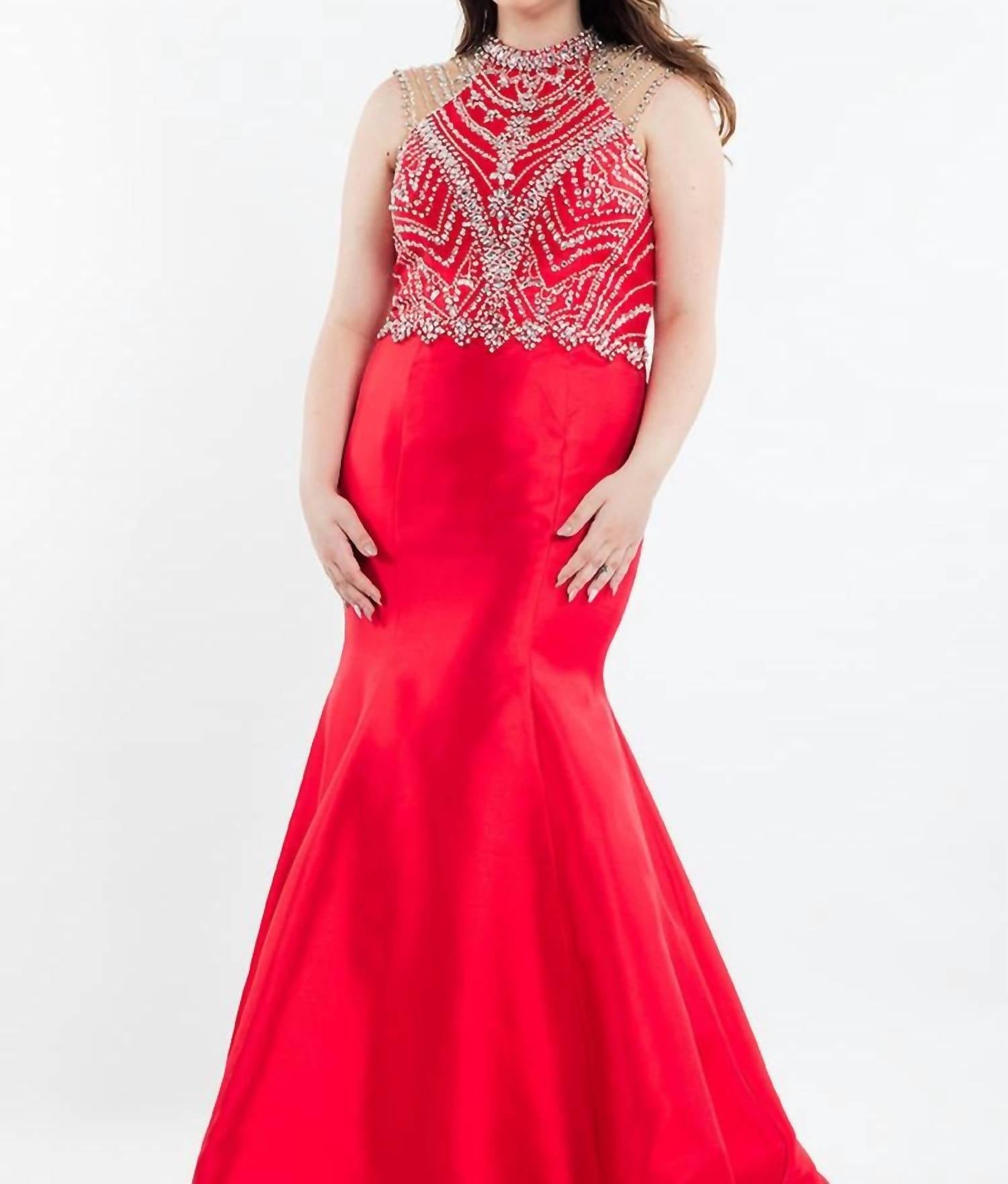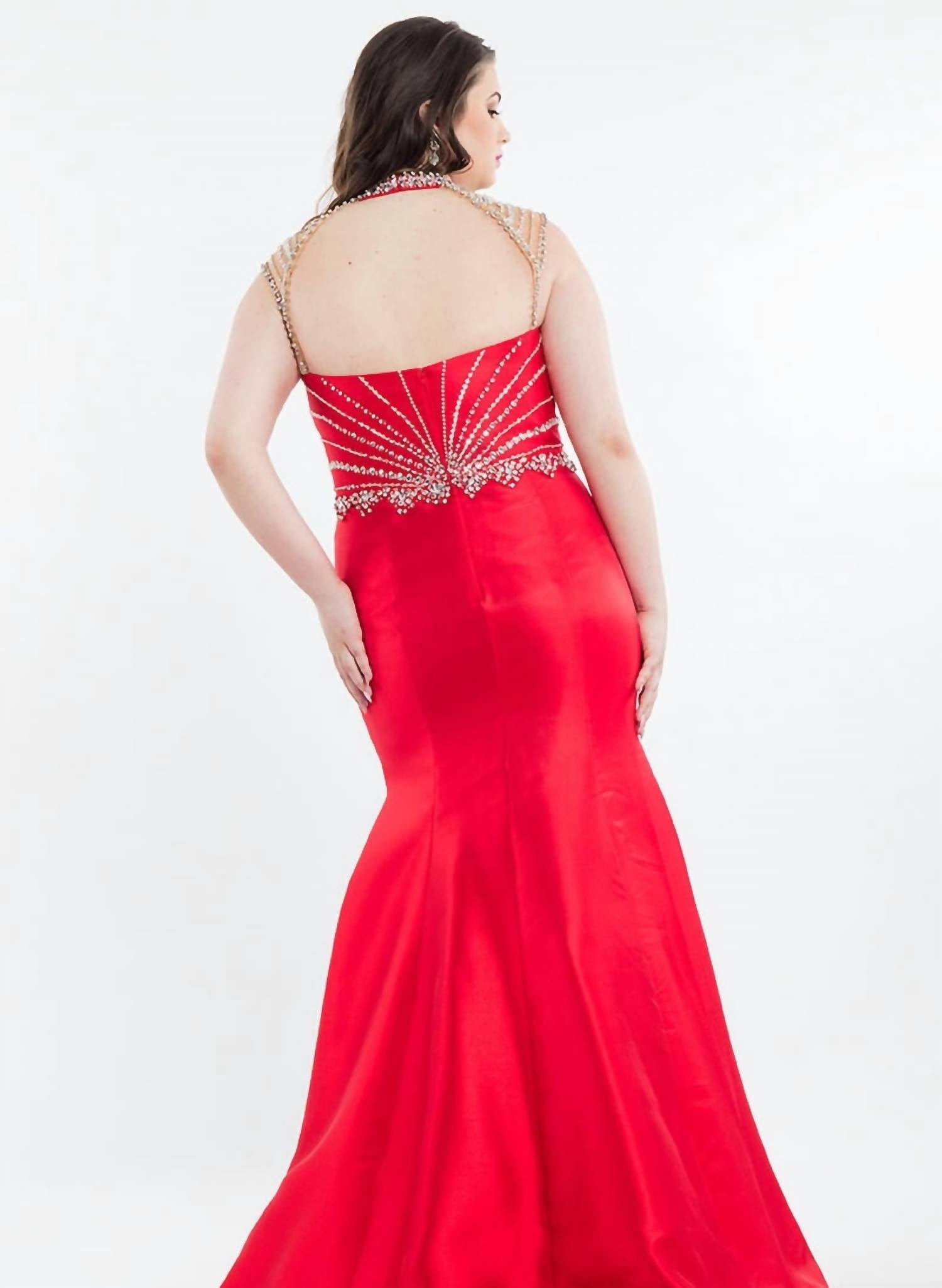 Just add a cute little clutch and a matching heel for the perfect event look. Turn heads at your next event with the Rhinestones Mikado Mermaid Gown by RACHEL ALLAN, perfect for prom. This stunning gown in striking red boasts a mesmerizing mermaid silhouette and a halter neckline, adorned with intricate rhinestone work on the bodice. Featuring an alluring open back, this gown closes with a convenient zip closure. Specifically designed for women in plus sizes, this elegant piece ensures you make a grand entrance.