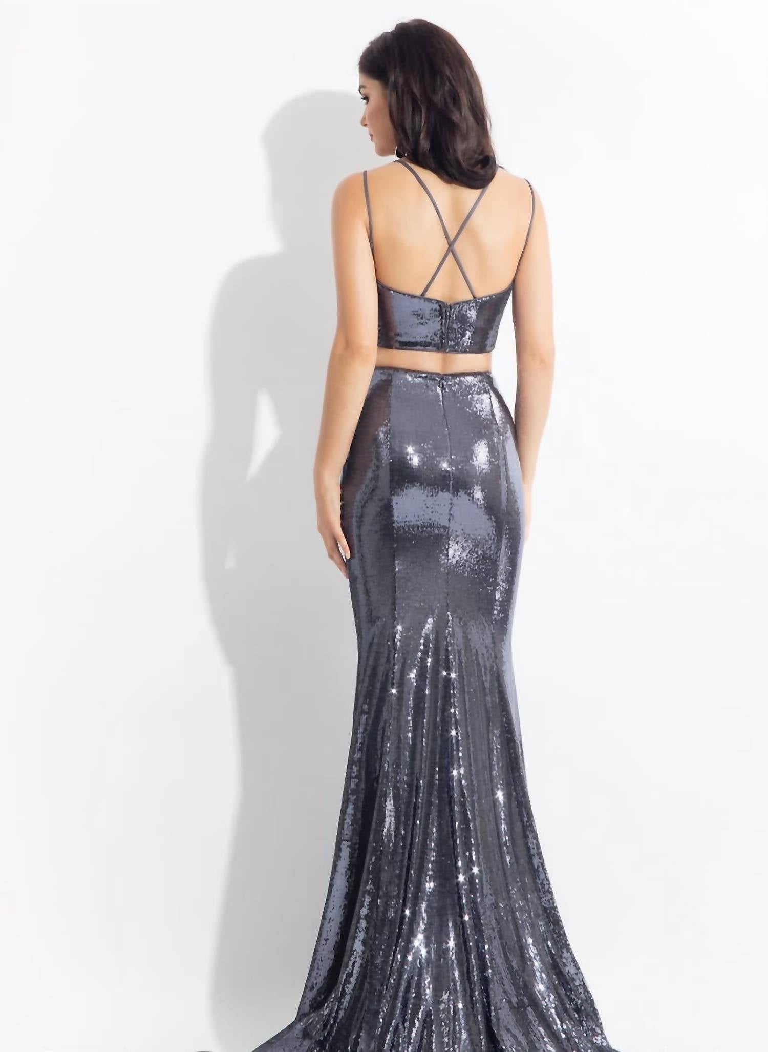 Just add a cute little clutch and a matching heel for the perfect event look. Elevate your evening wear with the Two-piece Sequin Strappy Evening Gown by RACHEL ALLAN, a masterpiece in platinum designed for unforgettable moments. This elegant gown features spaghetti straps and a striking squareneck, accentuated by its shimmering sequins. The full-length, mermaid silhouette gracefully extends to a train, emphasizing a figure-flattering design. Closure: Zip closure. Perfect for prom, it is fully lined for added comfort and ease.