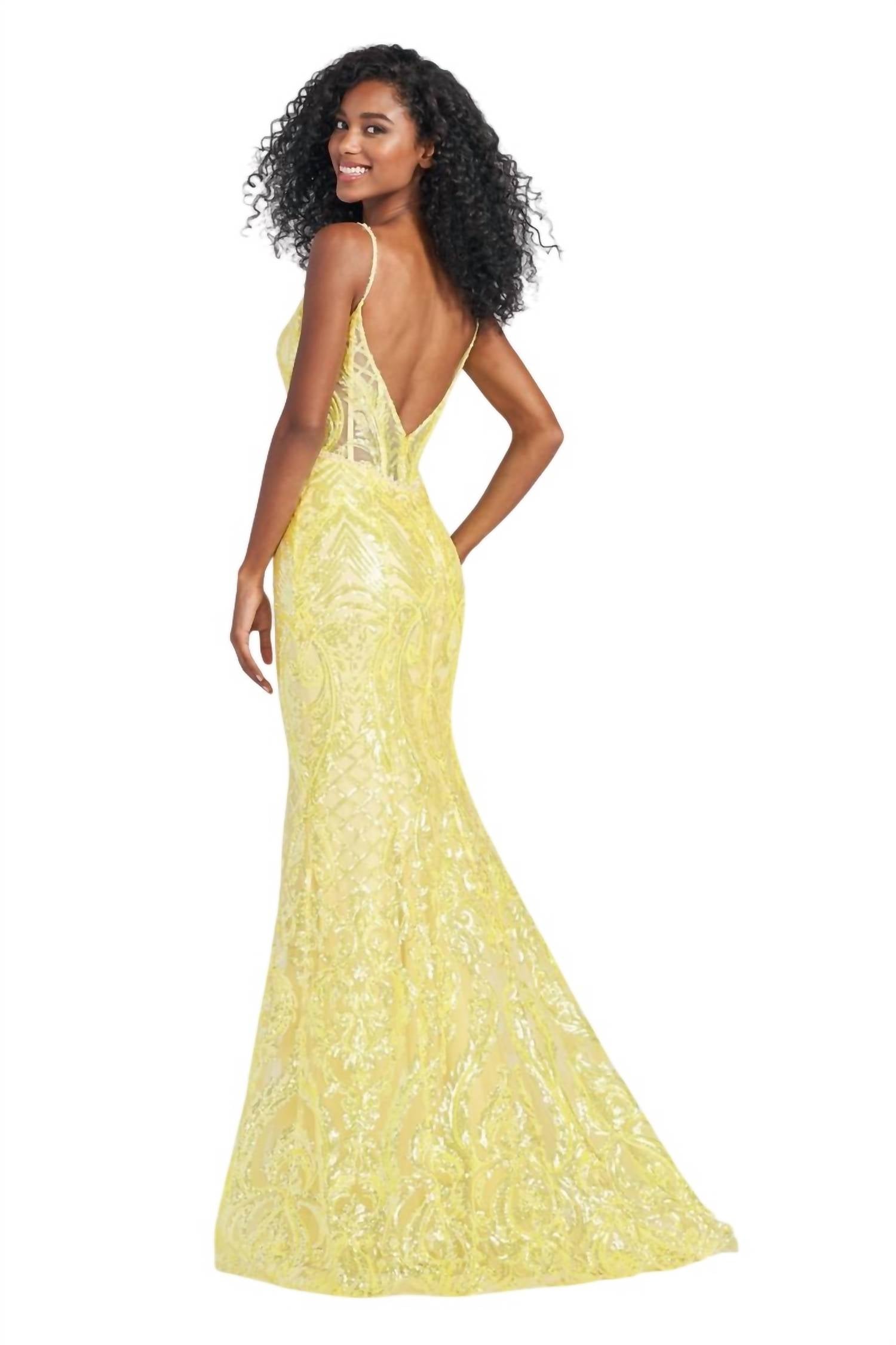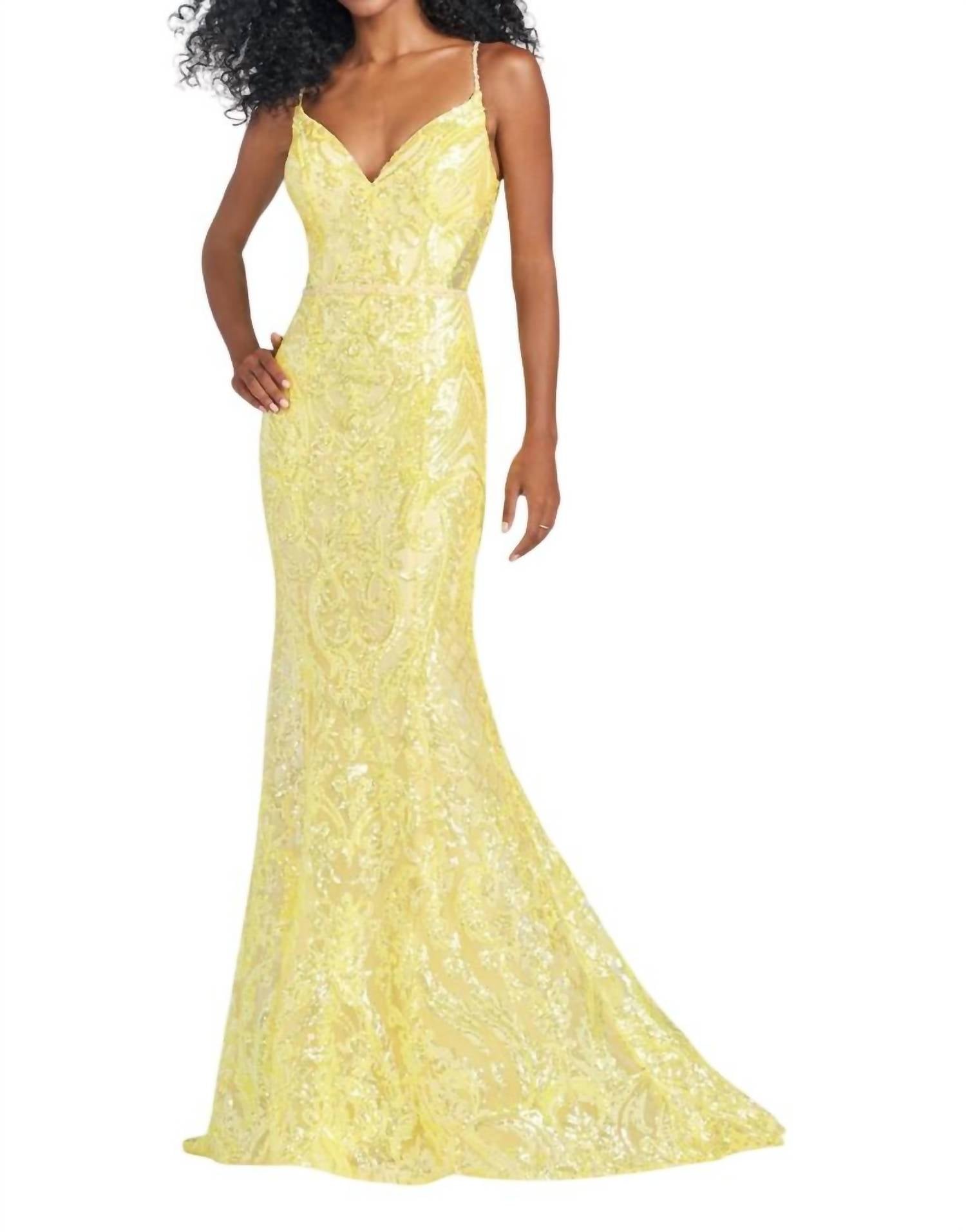 Turn heads in the cutest and most flattering evening dress. Elevate your prom style with the Embroidered Sequin Lace Dress by Ellie Wilde, an exquisite choice in enchanting yellow. Featuring delicate spaghetti straps and a captivating V-neckline, this dress ensures you stand out. Crafted with embroidered sequins lace, it offers a luxurious textured finish. Zip closure.