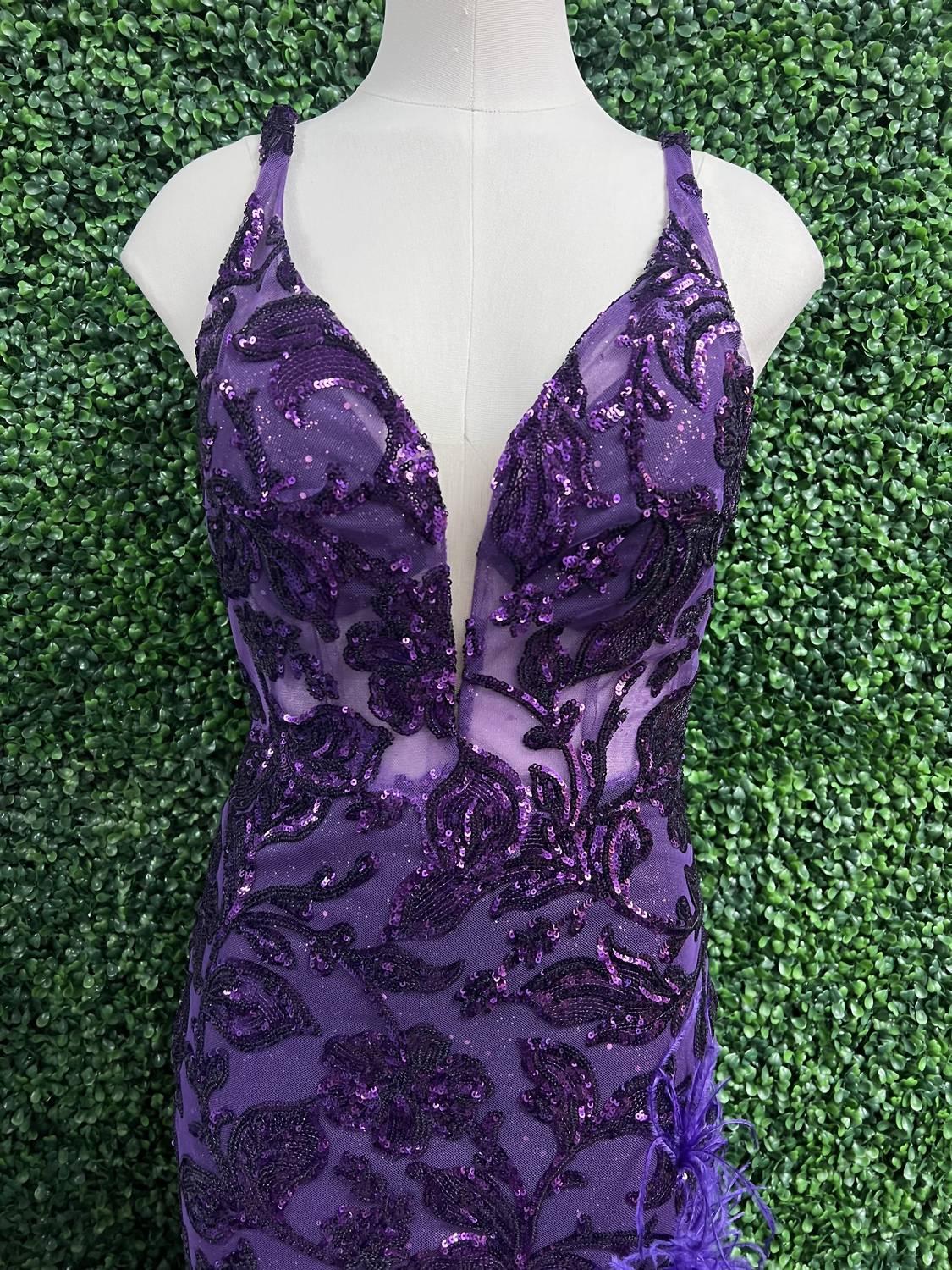 Step into the spotlight with AMARRA 88513, a stunning purple sequin prom gown designed to captivate. This exquisite dress boasts machine-embroidered sequins, featuring a dramatic feather-embellished skirt slit that moves elegantly. The gown's deep V-neckline in the front and back accentuates a graceful silhouette, while the sweeping train ensures a show-stopping entrance. Made from premium sequin and feather materials, this gown perfectly blends elegance and boldness for unforgettable events.
