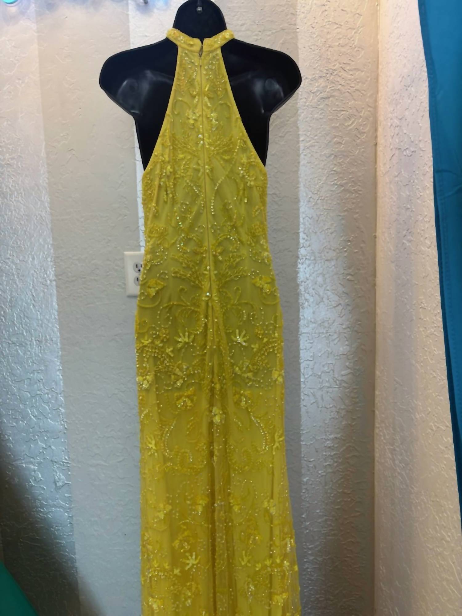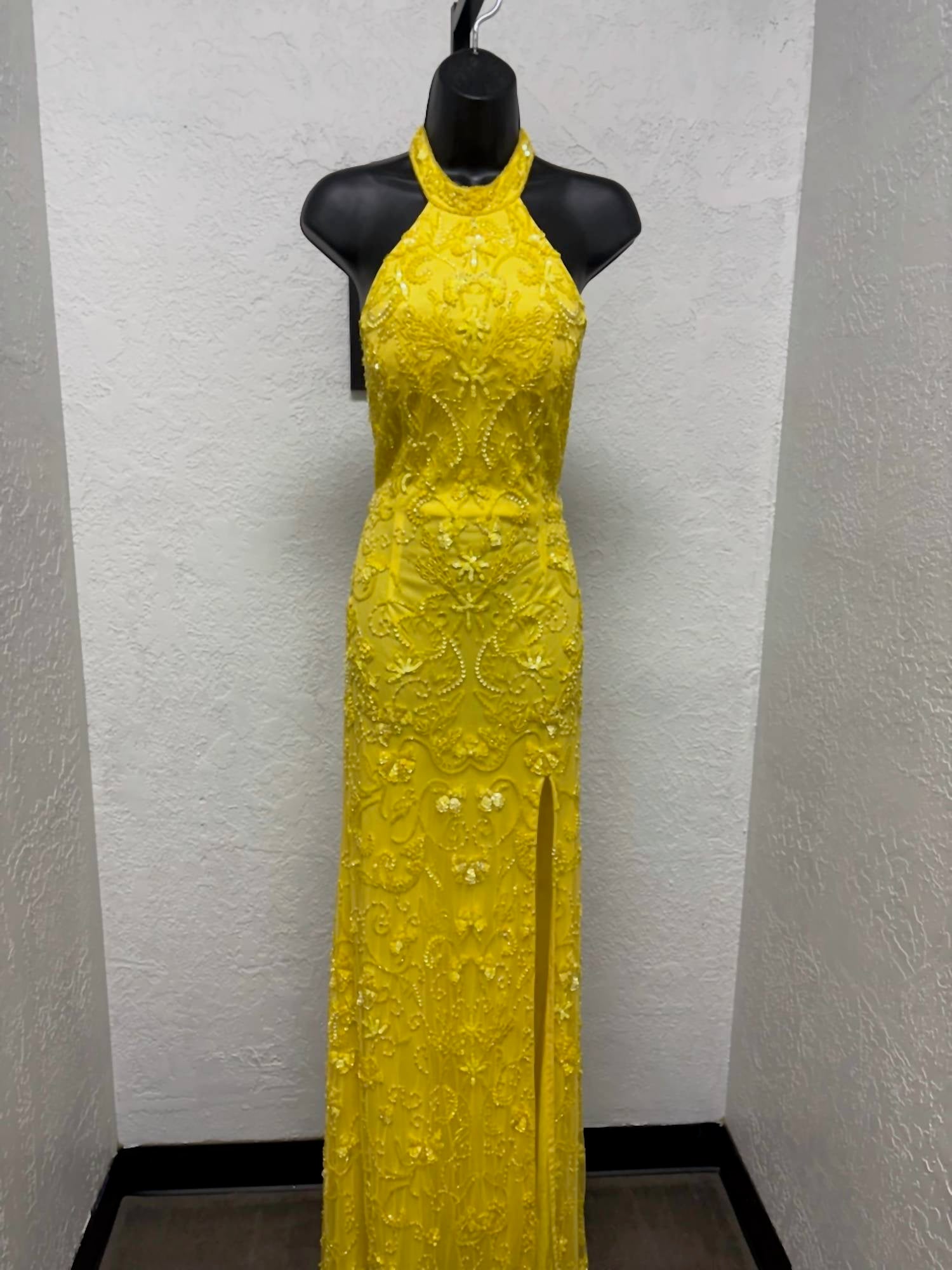 Turn heads in the cutest and most flattering evening dress. Elevate your prom look with the Beaded Tulle Halter Prom Dress by RACHEL ALLAN, a stunning piece in vibrant yellow. This women's dress features a flattering sheath silhouette and intricate beaded tulle for added elegance. The floor-length design includes a stylish slit, complemented by a sleek halter neckline and sleeveless cut. Closure: Zip closure.