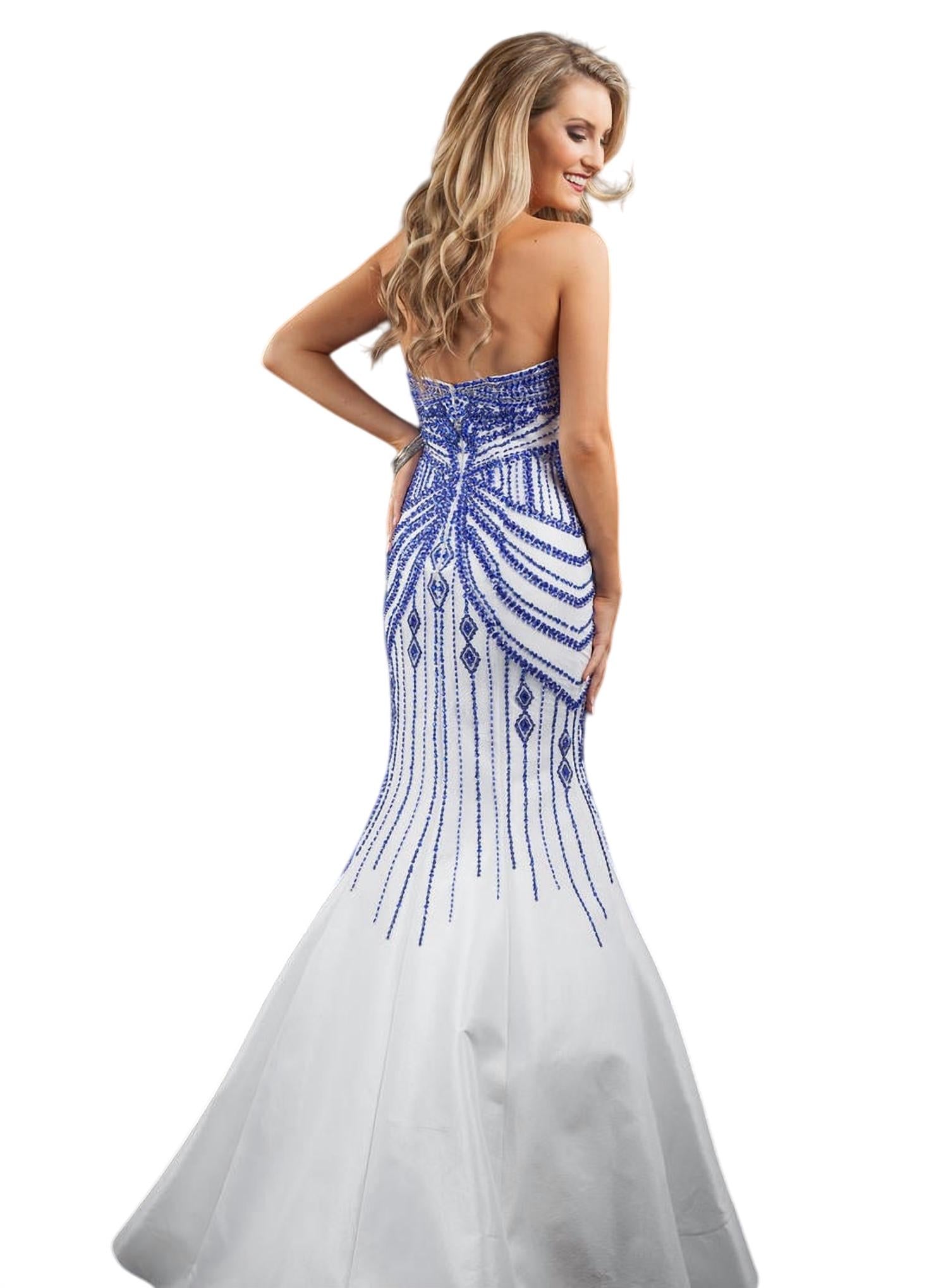 Looking for that perfect event dress? Look no further... Turn heads at your next event with the Strapless Beaded Taffeta Prom Gown by RACHEL ALLAN. This stunning mermaid silhouette gown in white and royal is crafted from luxurious taffeta and features intricate beadwork for added glamour. Designed with a sweetheart neckline, the dress has a zip closure for a perfect fit.